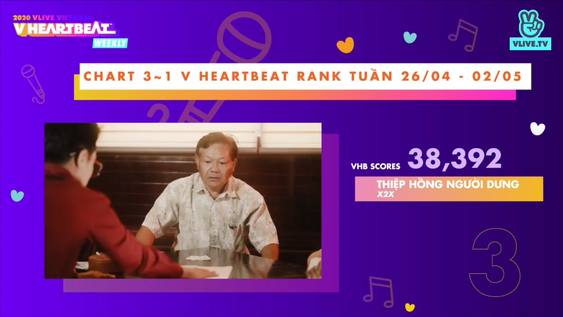 Đến với thời khắc quan trọng nhất là công bố kết quả top 3, Amee đã không giấu được sự hồi hộp của mình. Tuy nhiên, Jun Vũ lại khiến cho 2 đồng nghiệp bất ngờ hơn nữa khi tuyên bố top 3 BXH V Heartbeat Weekly tuần này hoàn toàn không có sự thay đổi so với tuần trước. Nghĩa là Thiệp hồng người dưng (X2X) #3, Là 1 thằng con trai (Jack) #2 và Thích thì đến (Lê Bảo Bình) #1. Đây quả thật là một kết quả không ai có thể ngờ tới, nhất là đối với khán giả của VLive.