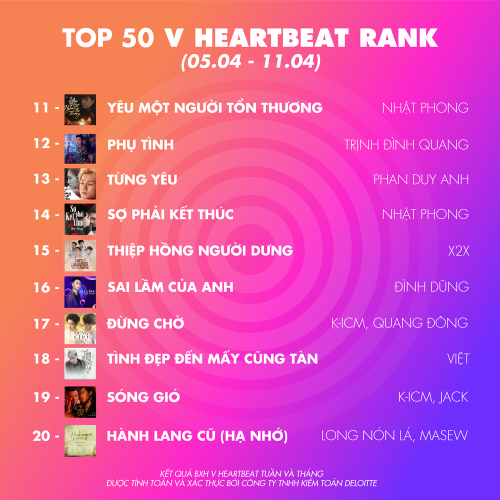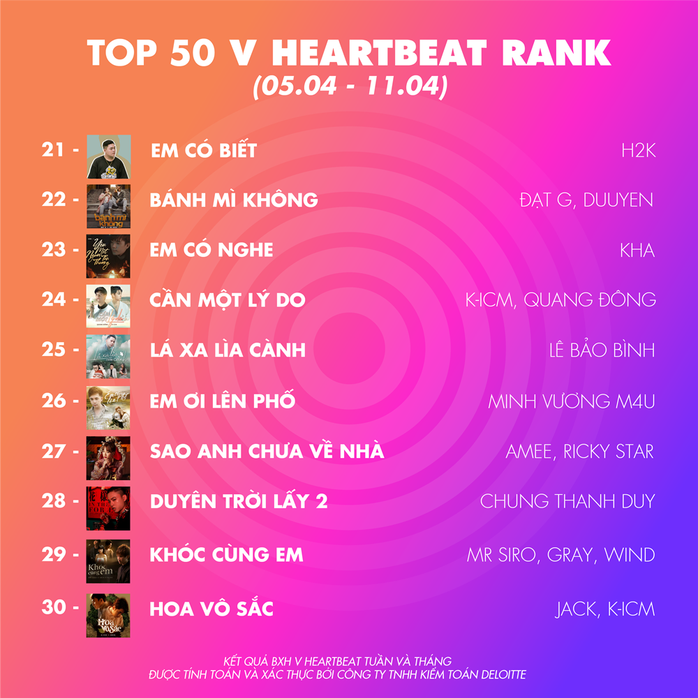 Tối ngày 16/4, kết quả BXH V Heartbeat Weekly vẫn được công bố như lịch trình thường lệ, tuy nhiên để đảm bảo lệnh cách ly xã hội nên số phát sóng tuần này sẽ không được livestream cùng hai VJ và khách mời. Thay vào đó, nhà sản xuất đã quyết định công bố kết quả BXH dưới hình thức online để đảm bảo cho khán giả vẫn theo dõi được tình hình “chiến trận” V Heartbeat Weekly ra sao.