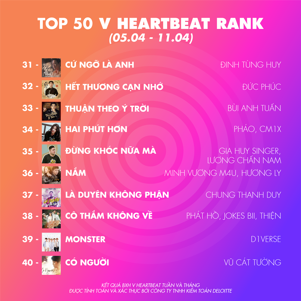 Nếu như tuần trước Monster của D1verse vẫn còn ung dung “chiếu trên” thì tuần này, vị trí đầu bảng phải nhường lại cho Hơn cả yêu từ Đức Phúc. Bản tình ca quốc dân này chứng tỏ sức hút khủng của mình khi trụ hạng liên tiếp nhiều tuần trong BXH. Có thể trong tuần sắp tới, Đức Phúc và Jack sẽ có một màn rượt đuổi gay cấn trên đấu trường V Heartbeat Weekly cho mà xem.