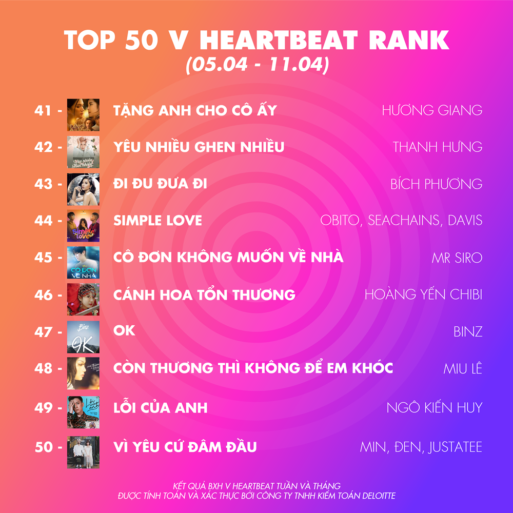 Theo đó, từ vị trí 50 đến 11 không có quá nhiều sự biến động khi các thứ hạng so với tuần trước chỉ thay đổi “nhẹ” một chút. Nổi bật từ vị trí 50 đến 11 có thể kể đến những cái tên như: Hương Giang, Vũ Cát Tường, Min, Đức Phúc,…