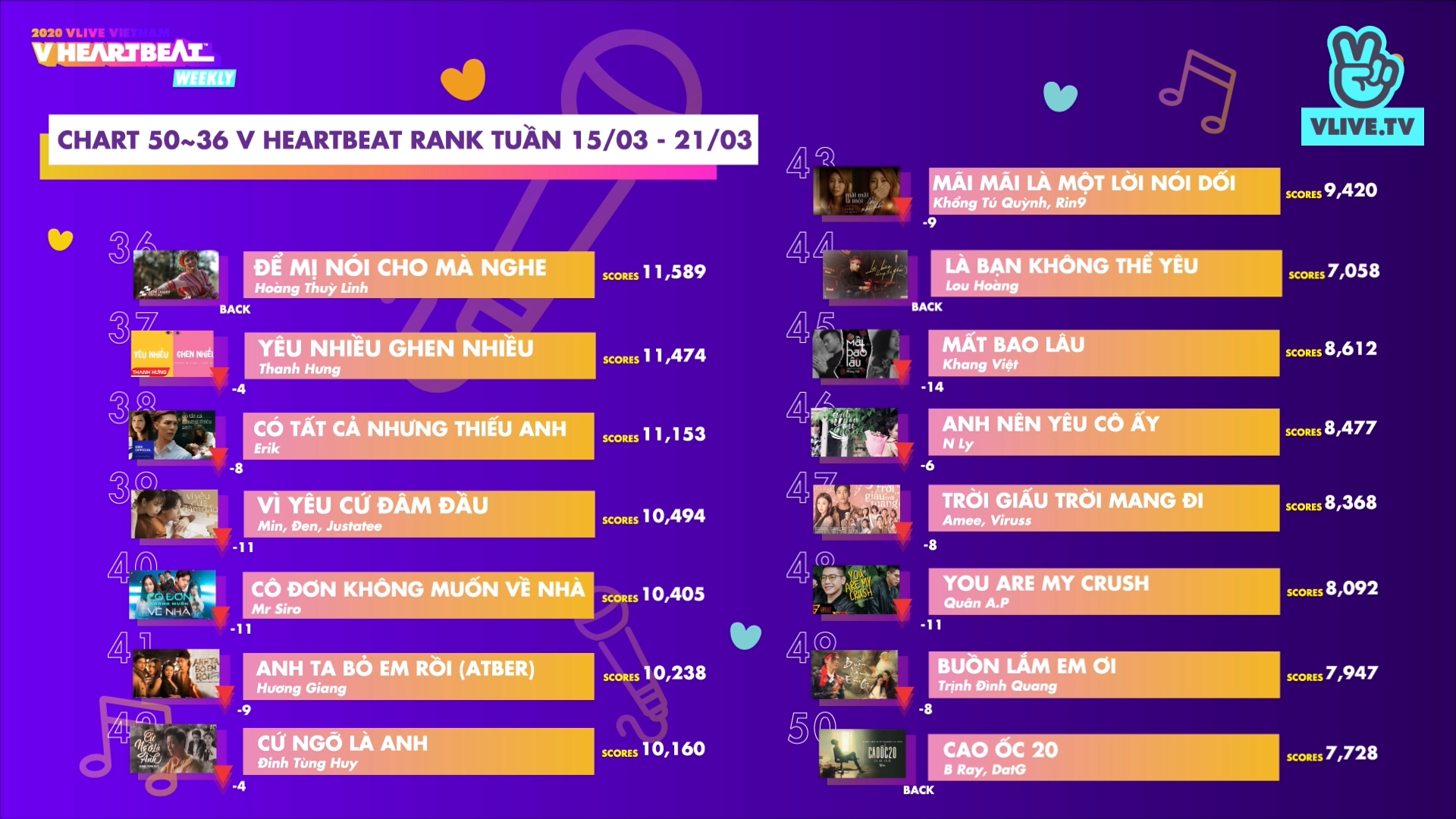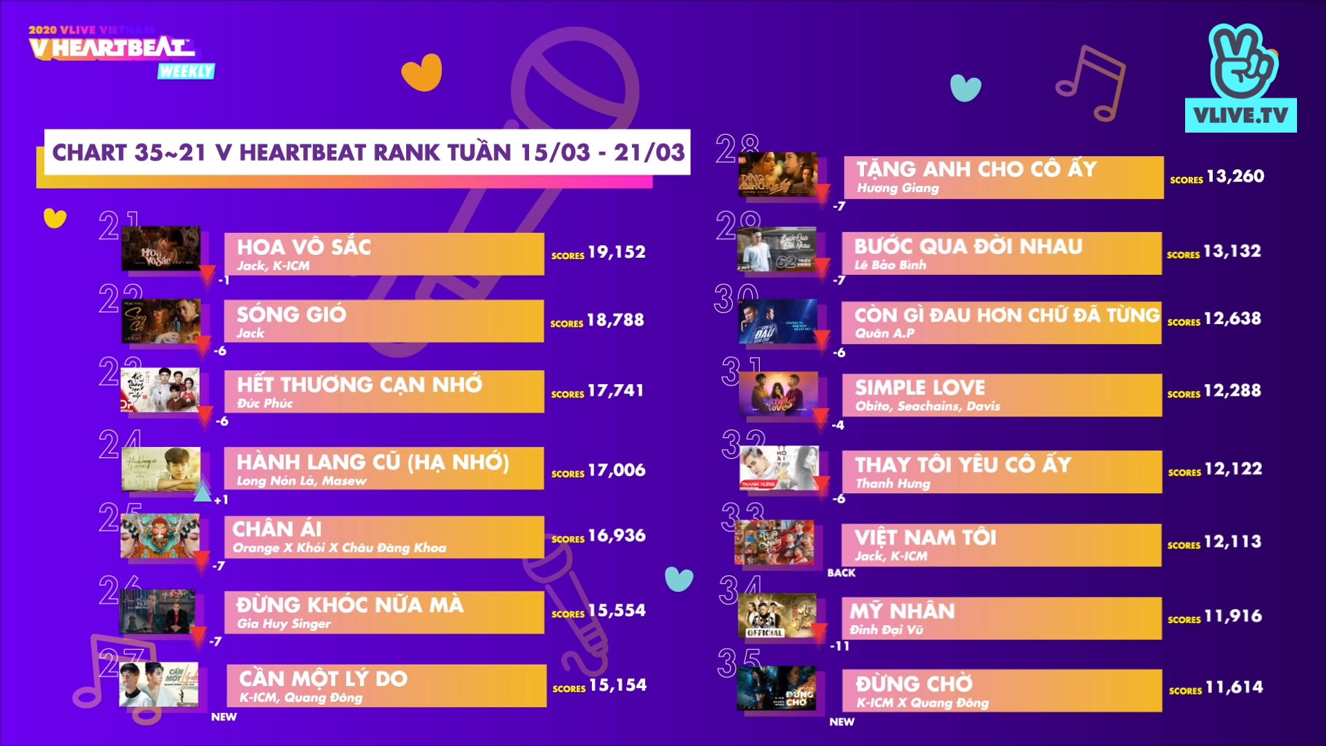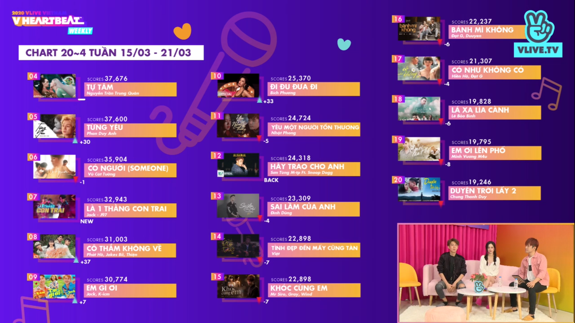 Mở đầu chương trình V Heartbeat Weekly tuần này, bộ ba Ngô Kiến Huy, Jun Vũ và Gin Tuấn Kiệt đã cùng nhau điểm lại danh sách ca khúc từ vị trí 50 đến 21. Trong danh sách kết quả được công bố, không khó để nhìn ra những cái tên quen thuộc như: Hoàng Thùy Linh, Hương Giang, Jack, K-ICM,…
