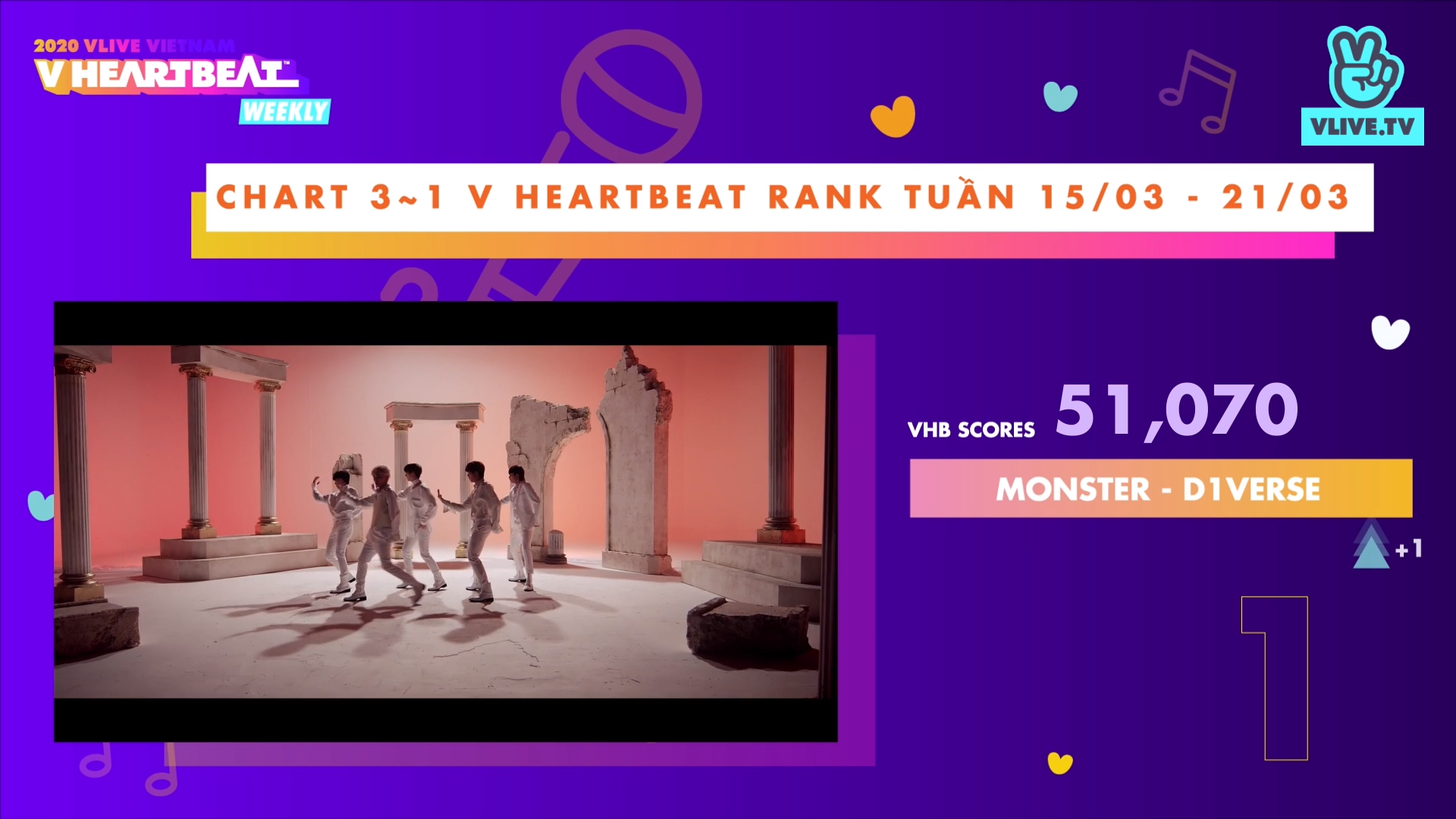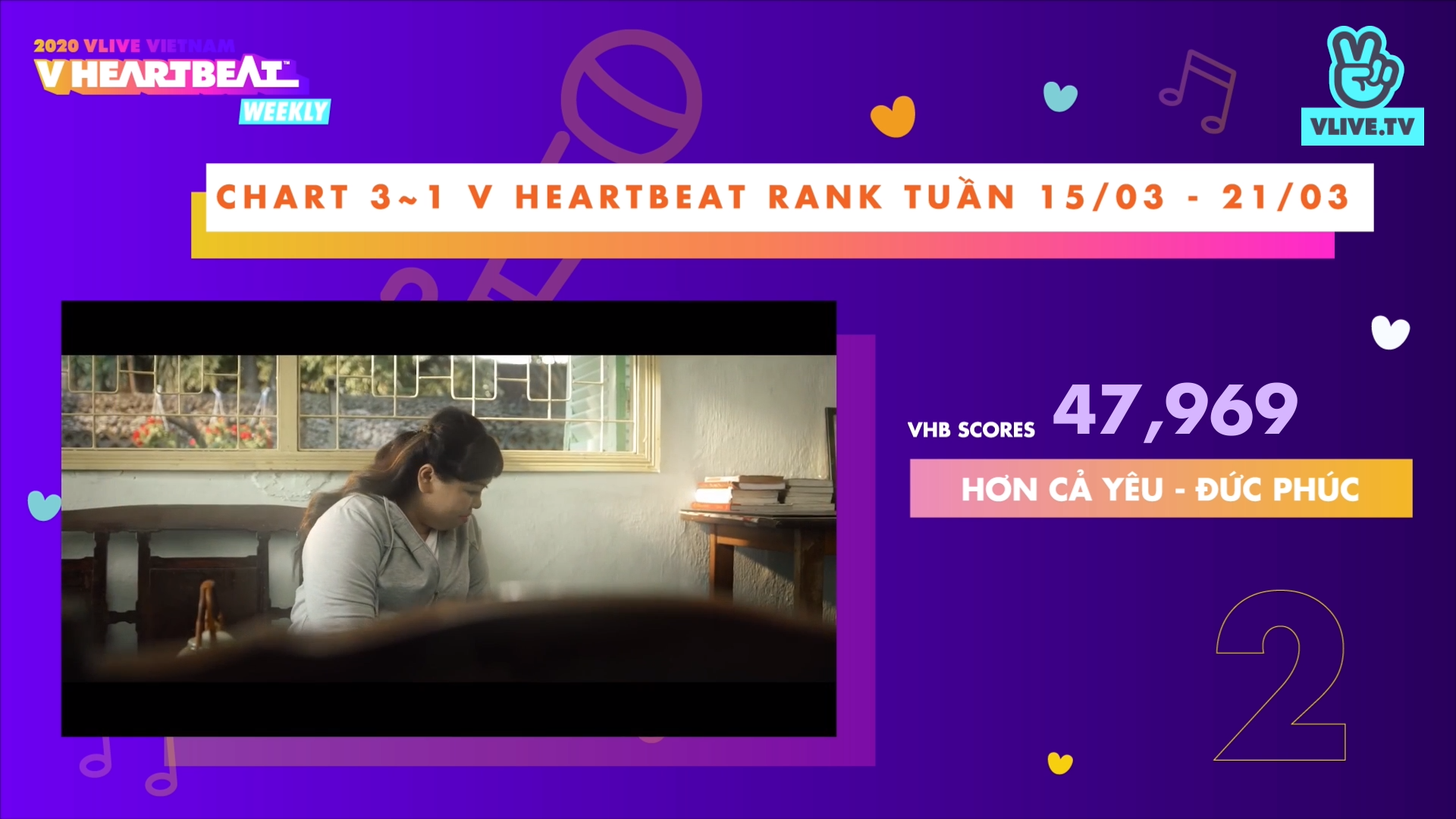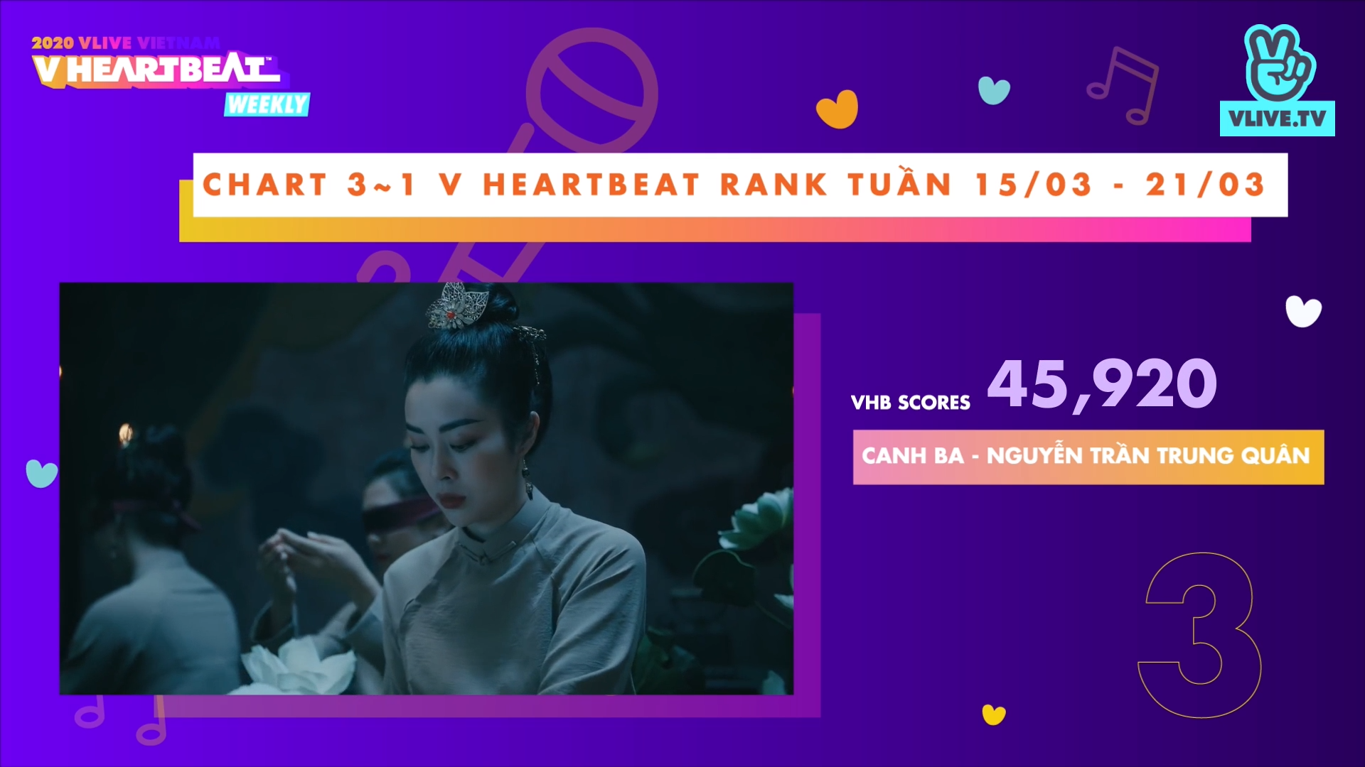 Số điểm V HEARTBEAT RANK được tổng hợp từ Bảng xếp hạng (BXH) âm nhạc Việt Nam (V Music Chart https://vmusicchart.vn/ do CPI x KMCA x Naver thực hiện - chiếm 40% tổng số điểm) cộng lượng tim (20%) và bình chọn (40%) cho MV của các nghệ sĩ Việt trên V TODAY (https://vtoday.vlive.tv/ vheartbeat).