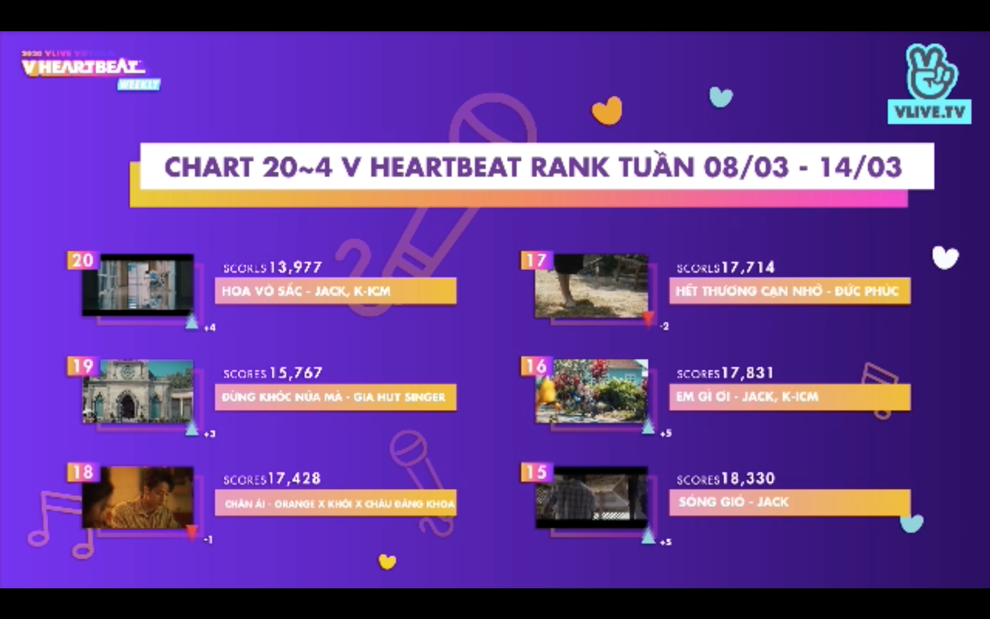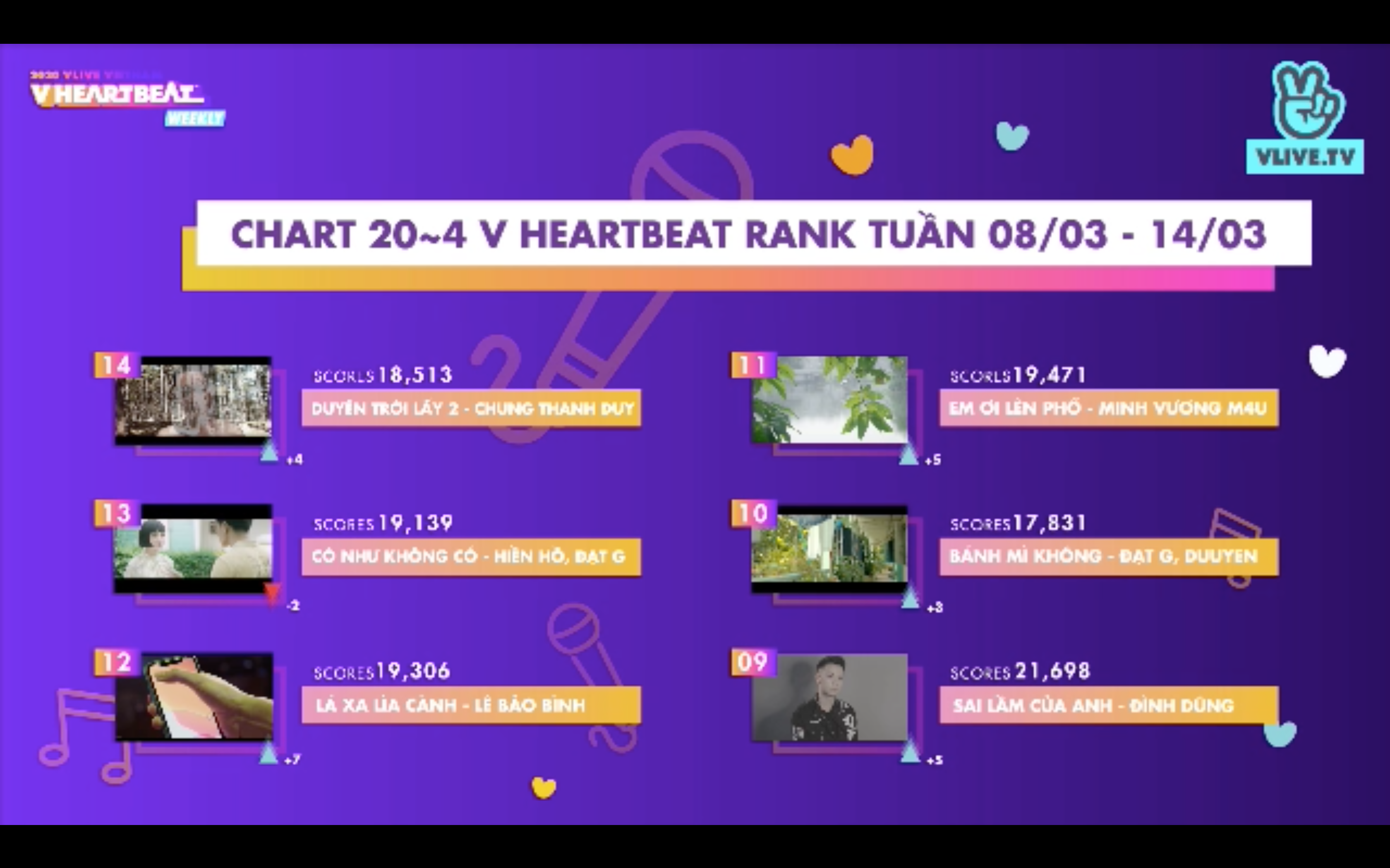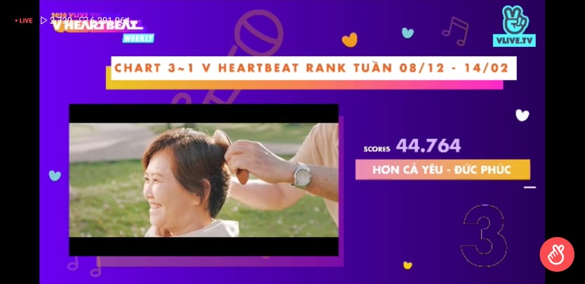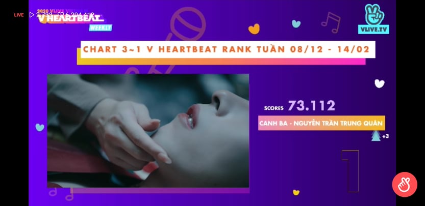 Số điểm V HEARTBEAT RANK được tổng h ợp từ Bảng xếp hạng (BXH) âm nhạc Việt Nam (V Music Chart https://vmusicchart.vn/ do CPI x KMCA x Naver thực hiện - chiếm 40% tổng số điểm) cộng lượng tim (20%) và bình chọn (40%) cho MV của các nghệ sĩ Việt trên V TODAY (https://vtoday.vlive.tv/vheartbeat).