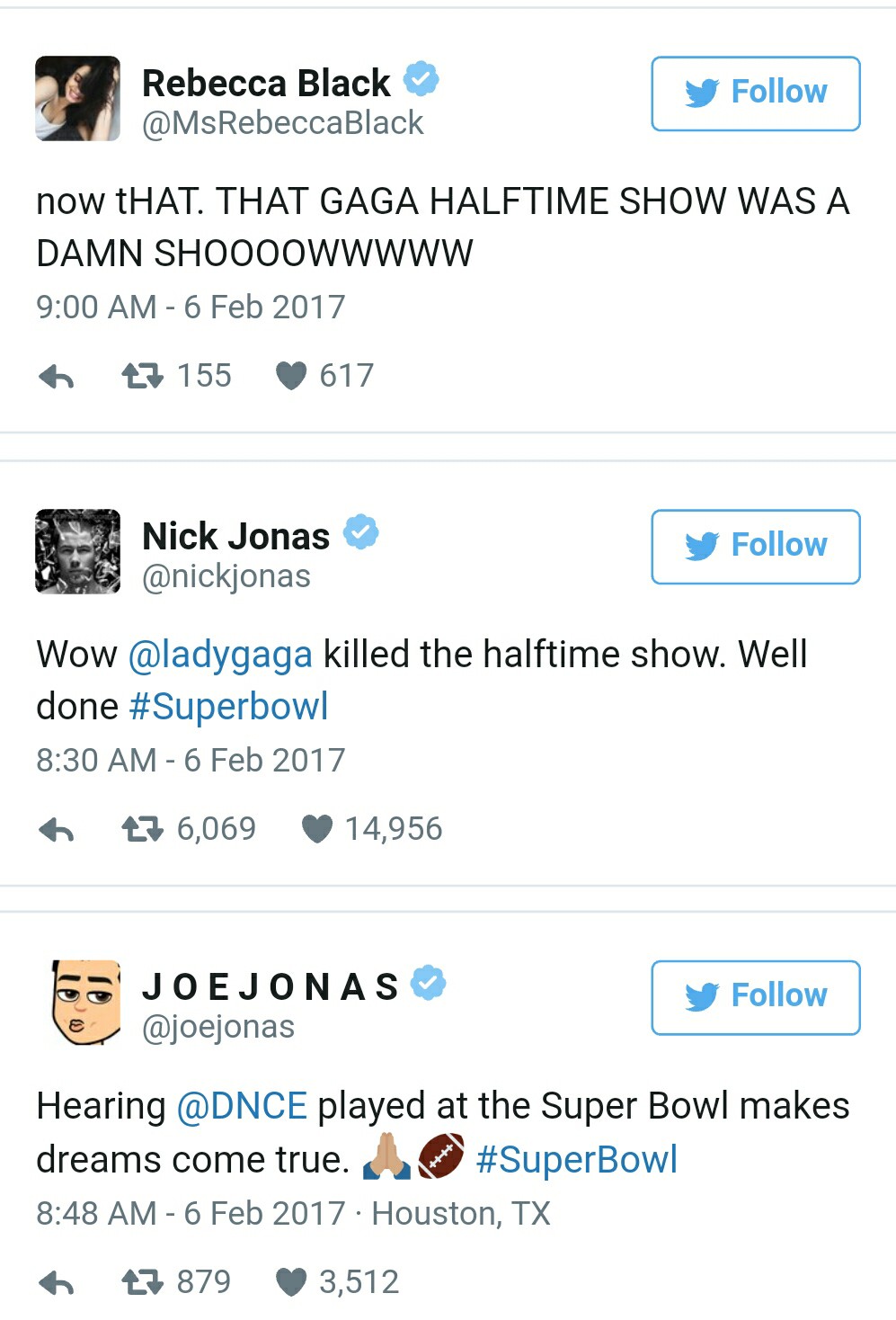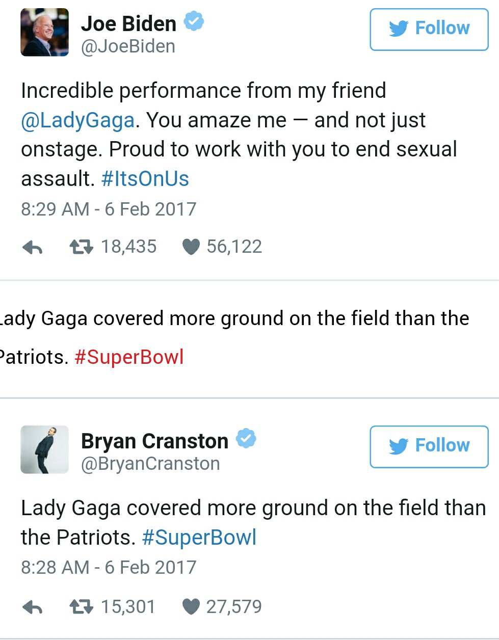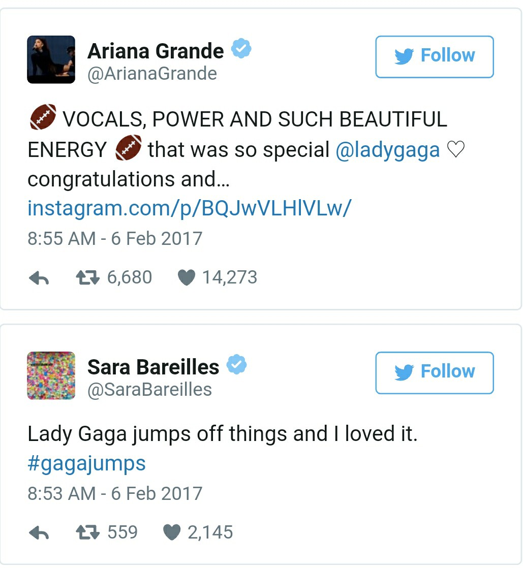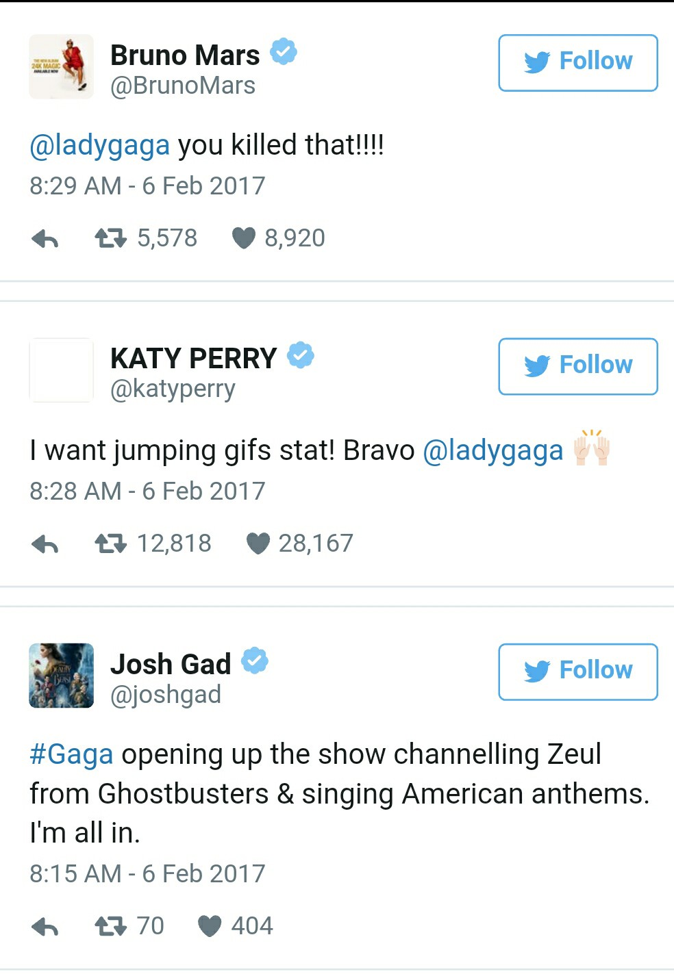 Sau khi phần trình diễn kết thúc, mạng xã hội như đã “bùng cháy” vì “mother monster”. Không chỉ hàng triệu khán giả theo dõi cảm thấy sung sướng mà những người nổi tiếng cũng công khai bày tỏ sự yêu mến dành cho Lady Gaga.