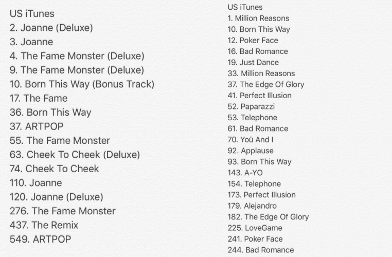5 album vào top 10 và 14 single khác trở lại Top 100 Itunes US. (Tham khảo: Hội những Little Monster Việt Nam tôn sùng Lady Gaga)