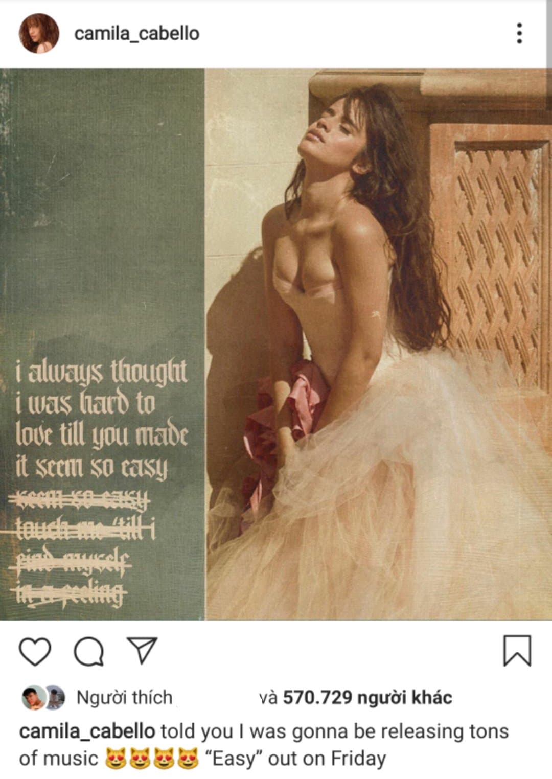 Đồng thời, nữ ca sĩ cũng cho biết sẽ phát hành thêm một ca khúc mới có tên là Easy vào thứ 6 sắp tới đây. Mặc dù chỉ mới nhá hàng poster cho ca khúc nhưng Camila Cabello đã “thiêu đốt” trái tim người hâm mộ với tạo hình xinh đẹp “sáng bừng bừng”.