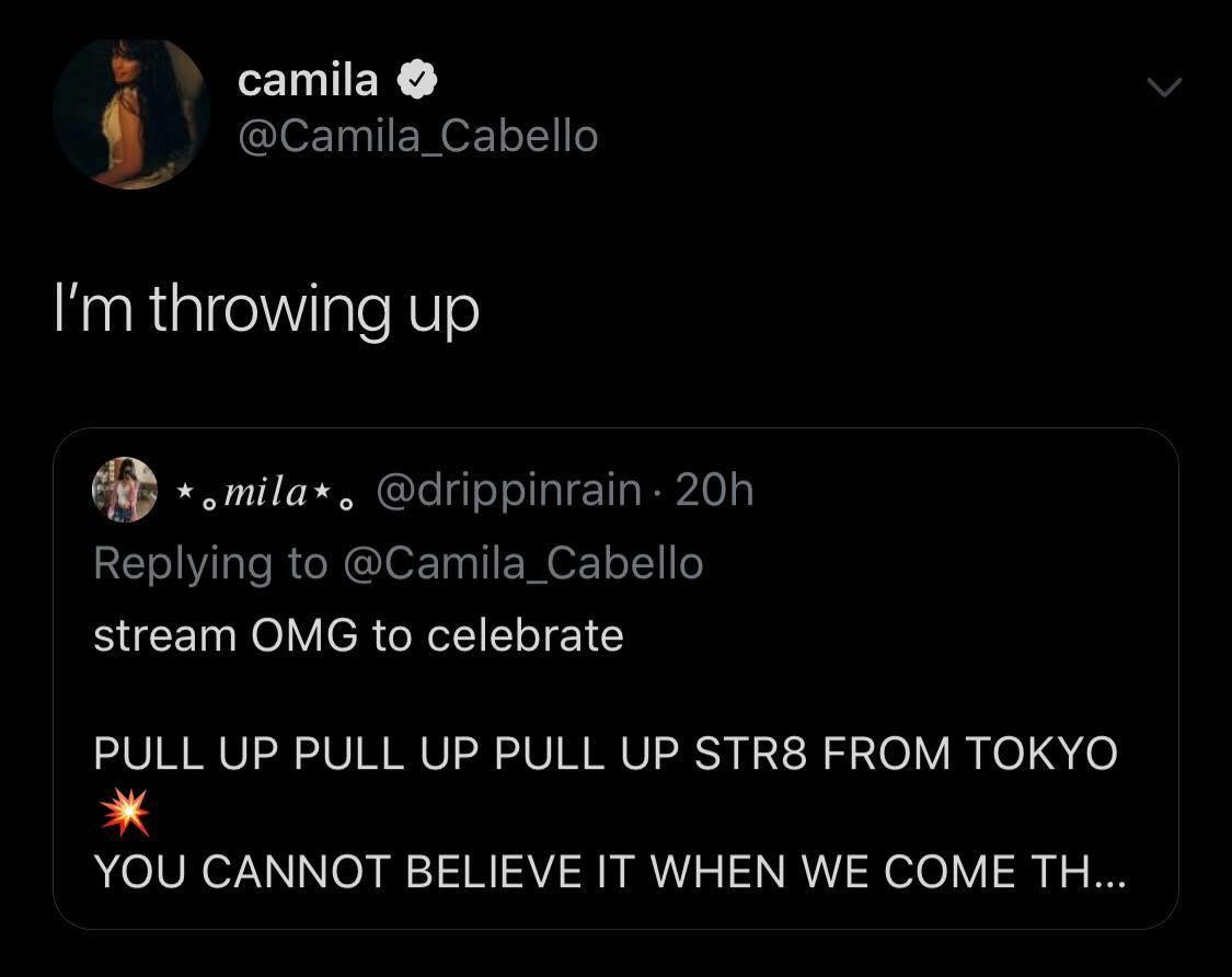 Mới đây, một tài khoản trên Twitter đã đăng tải một dòng tweet nói rằng họ đang nghe ca khúc OMG của Camila kèm theo một đoạn lời bài hát của ca khúc. Ngay lập tức cô nàng đã đáp lại tweet này, thế nhưng chẳng phải là một lời cảm ơn gì đâu mà trái lại, cô nàng tỏ vẻ khó chịu: “Tôi đang nôn đây này”.