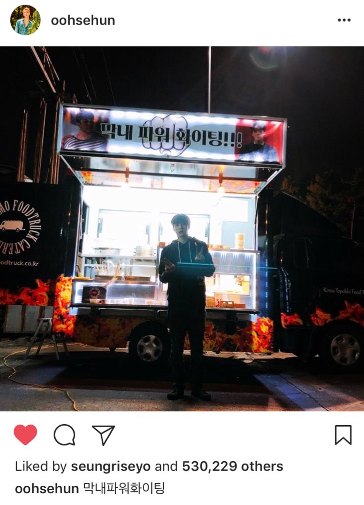 Mới đây, thành viên nhỏ tuổi nhất của EXO - Sehun chia sẻ một thông tin thú vị lên instagram cá nhân. Cụ thể, trong tấm hình được đăng tải, nam ca sĩ đứng cạnh một xe cà phê và đồ ăn vặt miễn phí với dòng chữ: “Năng lượng em út cố lên!”. Được biết, đây chính là món quà mà em út BigBang - Seungri tặng cho Sehun trong khi quay bộ phim do anh chàng thủ vai chính - Dokgo Rewind.