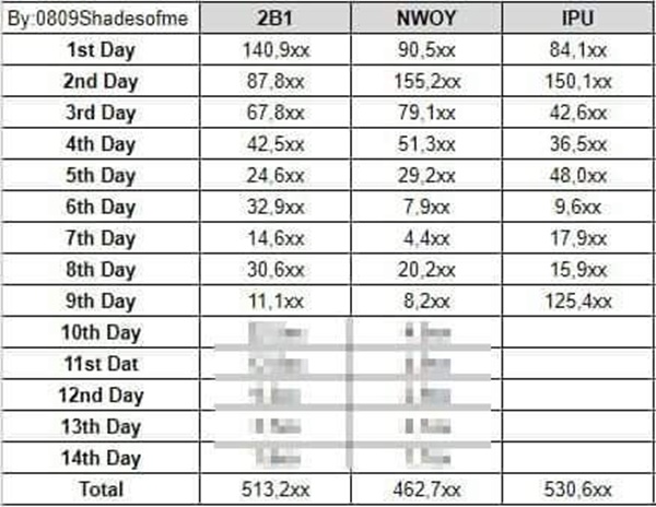 Bảng thống kê lượng tiêu thụ album của Wanna One suốt thời gian qua. Album I Promise U đến ngày thứ 9 đã tiêu thụ được hơn 500.000 bản, con số này tương đương với 2 album trước.