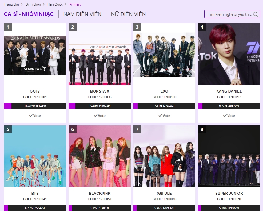 Kết quả bình chọn vòng Primary Vote hạng mục Ca sĩ/Nhóm nhạc được yêu thích nhất tính đến thời điểm sáng 22/9/2019.