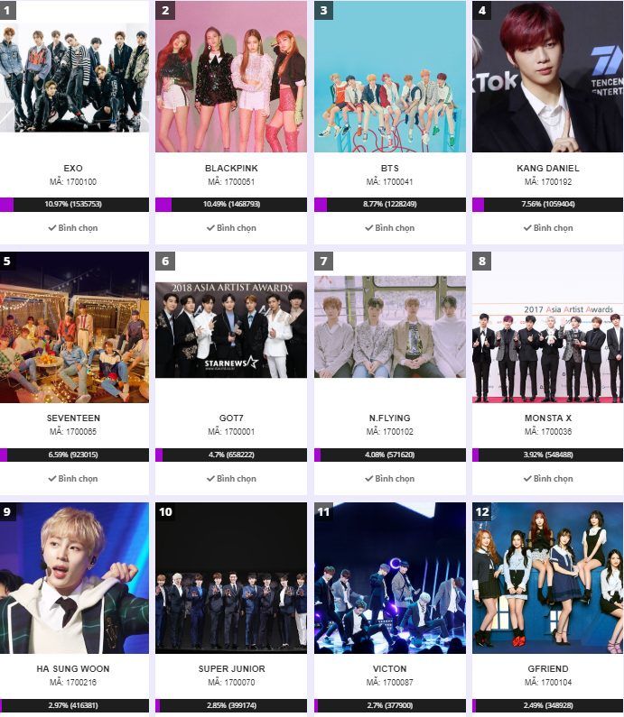 Lễ trao giải Asia Artist Awards 2019 (AAA 2019) cùng hạng mục bình chọn Ca sĩ/Nhóm nhạc Hàn Quốc được yêu thích nhất vẫn đang “sôi sùng sục” khi thứ hạng chuyển biến liên tục. Theo đó, tính đến thời điểm kết thúc vòng bình chọn đầu tiên Pre-Vote (14/9), các fan Kpop đã vô cùng phấn khích khi nhóm nhạc dẫn đầu không ai khác chính là “gà chiến” nhà SM - EXO với hơn 1,54 triệu lượt vote và chiếm tỉ lệ 10,97% kết quả bình chọn. Bám sát ngay sau đó là các girlgroup Kpop nhà YG - nhóm BlackPink với hơn 1,47 triệu lượt vote cùng tỉ lệ 10,49% kết quả bình chọn.