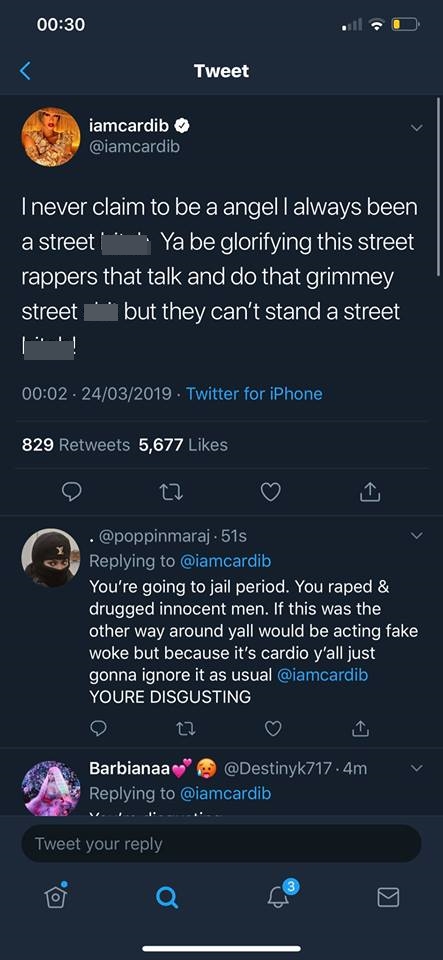 Ngay khi bị cộng đồng mạng ném đá tới tấp vì những câu chuyện nhạy cảm, Cardi B không hề nói một câu xin lỗi. Cô đăng một dòng trạng thái như sau: “Tôi chưa bao giờ nhận mình là thiên thần, tôi là 1 con rapper đường phố. Bạn tôn sùng ngưỡng vọng bọn rapper đường phố khác khi chúng làm mấy chuyện đồi bại thế này, nhưng vì tôi là một đứa con gái, họ lại không chấp nhận điều đó.”