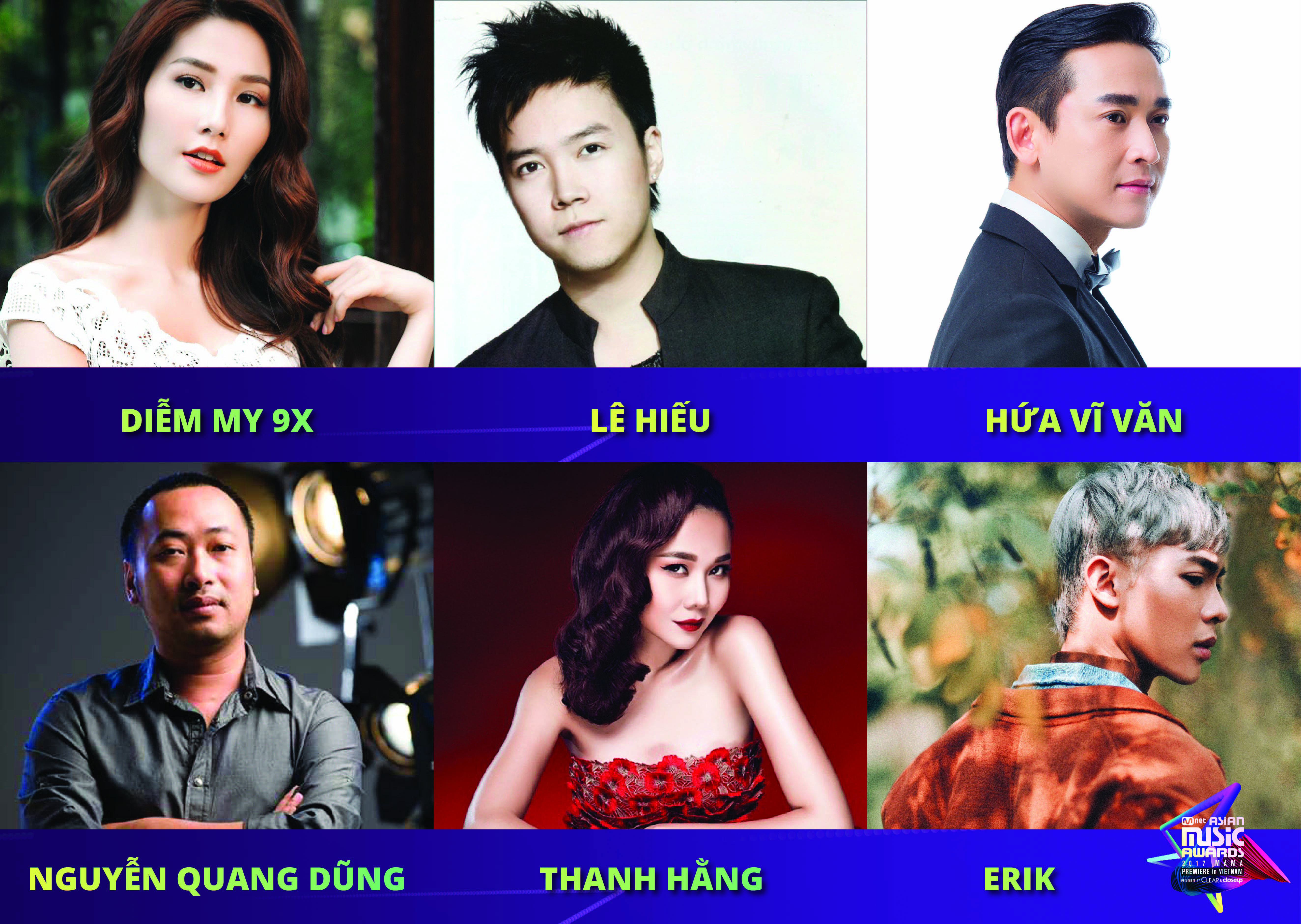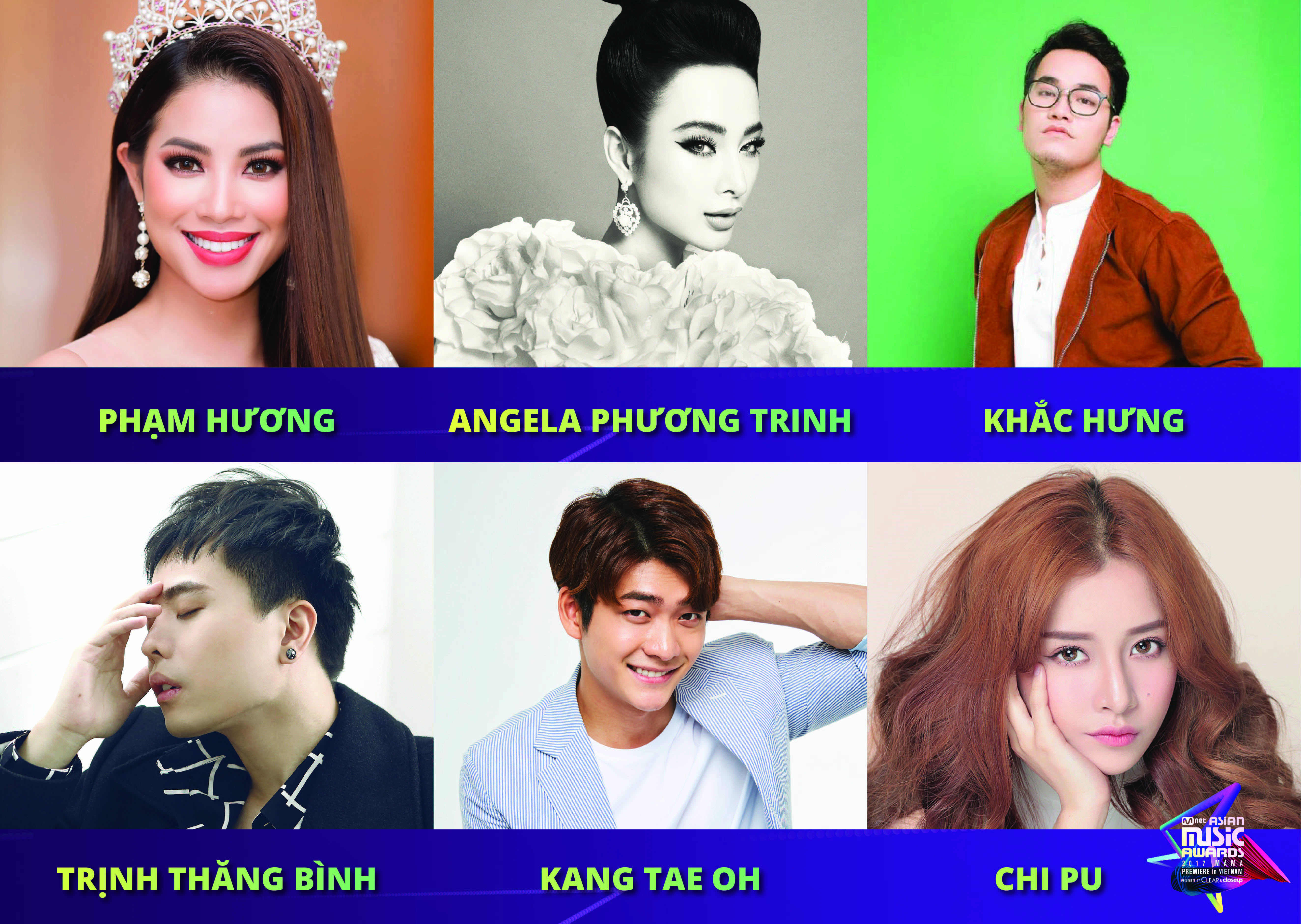 Bên cạnh đó, một loạt các tên tuổi đình đám của showbiz Việt: Thanh Hằng, Phạm Hương, đạo diễn Nguyễn Quang Dũng, Hứa Vĩ Văn, Diễm My 9x, Kang Tae Oh, Angela Phương Trinh, Lê Hiếu, Trịnh Thăng Bình, Erik, Khắc Hưng cũng đến với thảm đỏ của 2017 MAMA Premiere in Vietnam với tư cách là người trao giải thưởng.