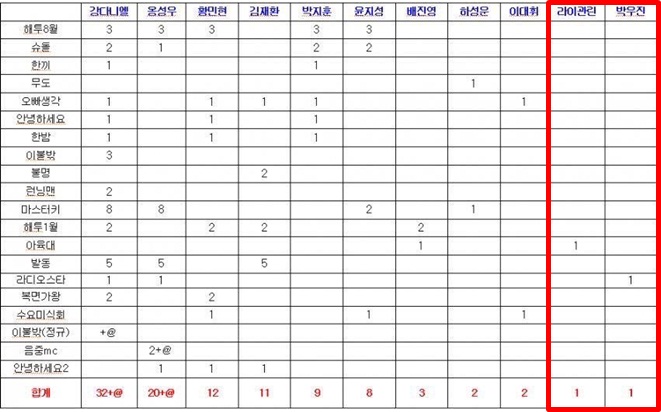 Bảng thông kê lịch trình cá nhân của Wanna One.