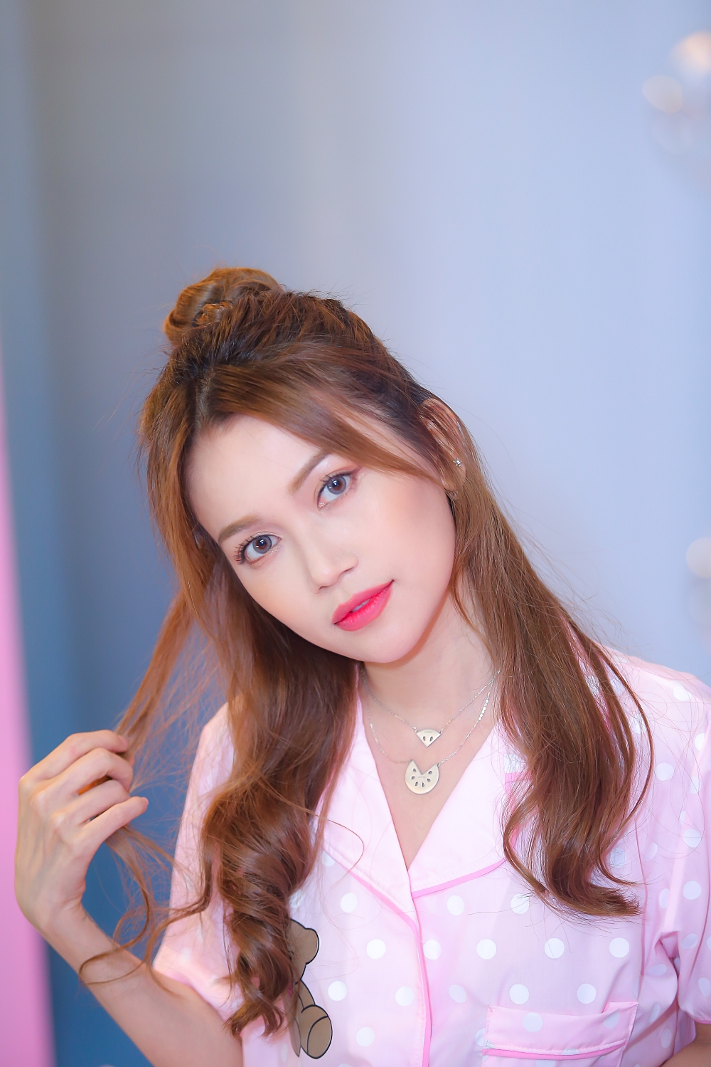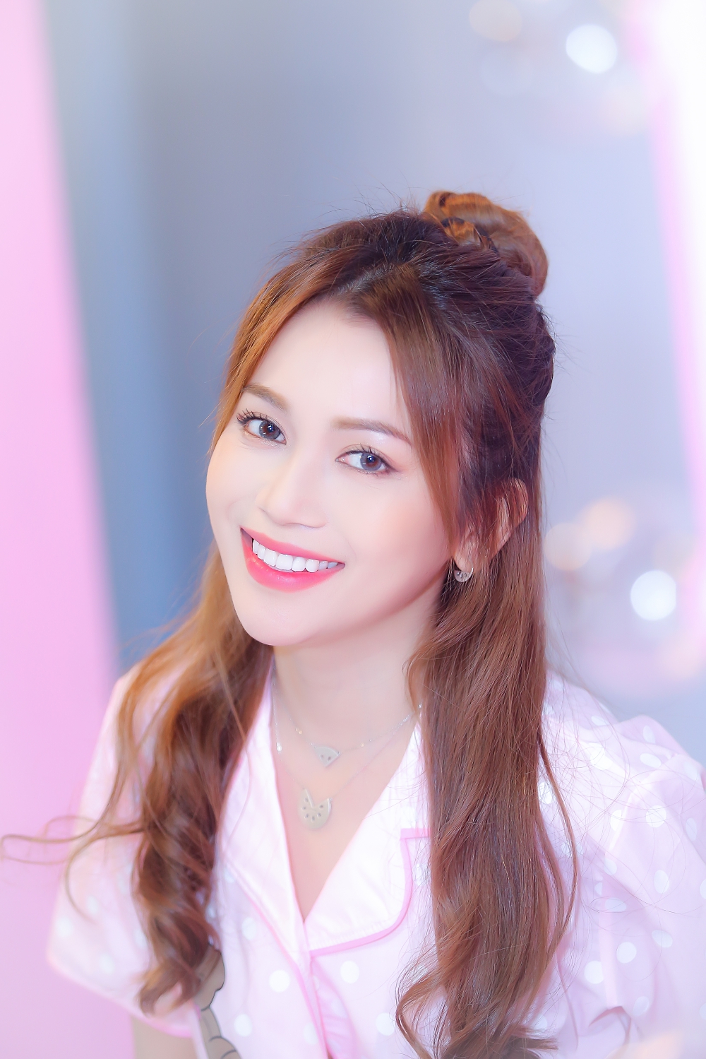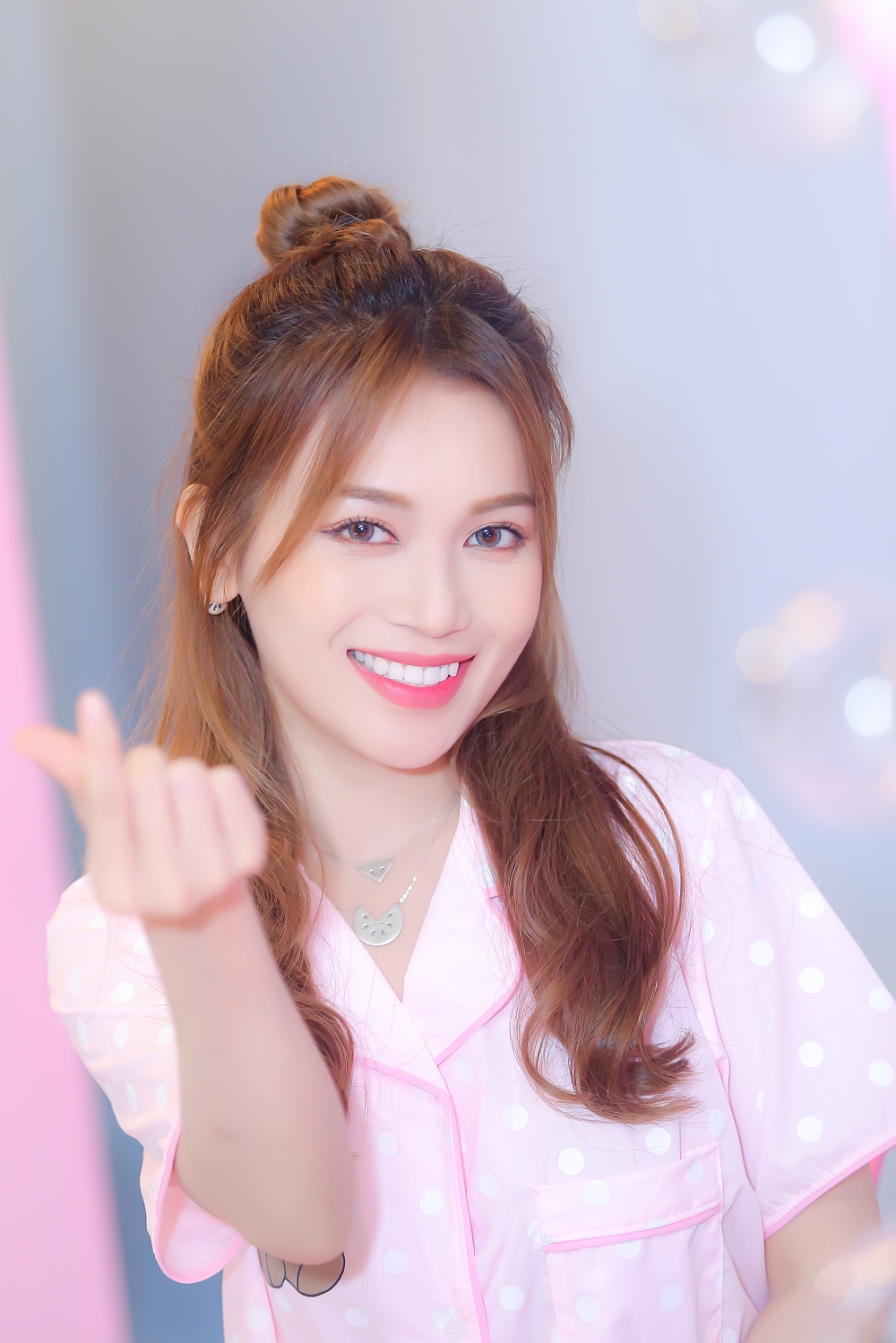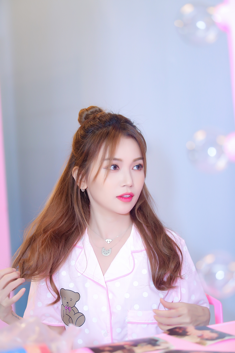 Cô đầu tư trang phục cũng như bối cảnh toàn màu hồng.