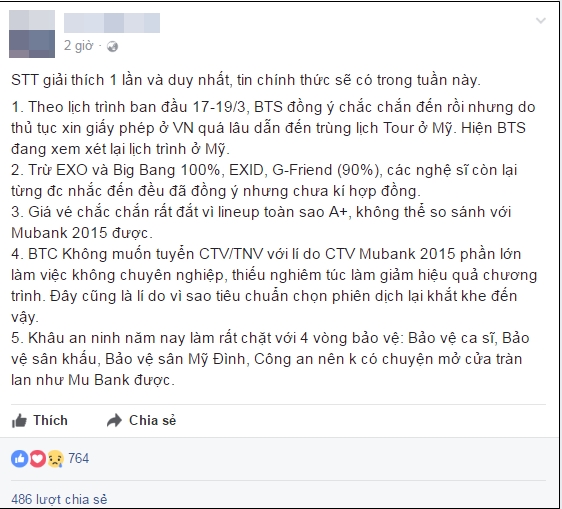 Cụ thể, cách đây ít phút tài khoản facebook này đã đăng tải một bài viết thu hút sự quan tâm mạnh mẽ từ người hâm mộ nói về sự kiện âm nhạc được cho là chương trình giao lưu văn hoá Việt - Hàn diễn ra tại Hà Nội vào tháng 3 này.