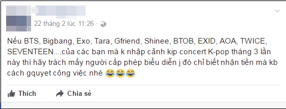 Nhớ nhé, nếu như idol của các bạn không nhập cảnh được thì là do… mấy người cấp phép nhé! - Một chia sẻ khác từ tài khoản facebook này có phần “rào trước”.