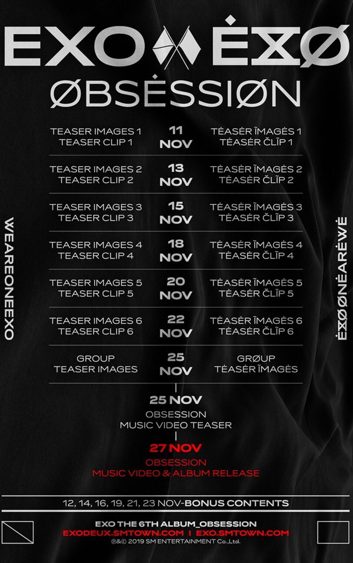 Trước đó, SM cũng giới thiệu lịch trình tung teaser cho album thứ sáu Obsession của EXO. Cụ thể hơn, vào các ngày 11, 13, 15, 18, 20 và 22 tháng 11 (Theo giờ Hàn Quốc), ảnh teaser của 6 thành viên sẽ được lần lượt tung ra vào 22h. Sau đó, ngày 25/11, ảnh nhóm đầu tiên cũng sẽ được giới thiệu tới khán giả kèm theo đó là teaser Mv ca khúc Obsession. Với những gì SM chọn lựa cho EXO trong lần trở lại này không khí bao trùm về khái niệm ngày tận thế và vũ khí chiến tranh đầy u tối và dữ dội, có thể thấy rằng lần trở lại này của nhóm sẽ vô cùng đặc biệt và đáng chờ đợi.