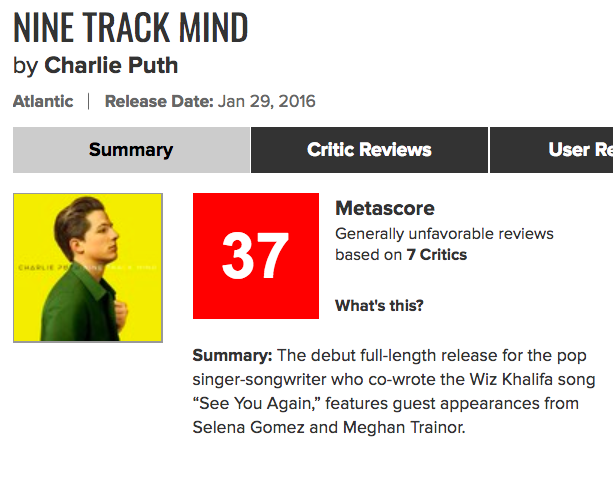 Sản phẩm đầu tay của Charlie Puth cũng không khá khẩm hơn trên mặt trận Metacritic.