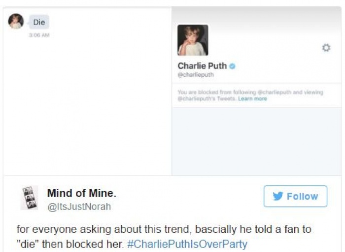 Tiếp nối những lùm xùm trên, nạn nhân tiếp theo của Puth lại làm rúng động hơn nữa. Vì lần này Puth đã nhắm vào chính fan hâm mộ của mình. Dựa theo bằng chứng được tung lên từ bạn fan kém may mắn đó, thì Puth đã rủa fan “Đi chết đi”. Ngay lập tức, Twitter dậy sóng với một trào lưu tẩy chay nổ ra nhắm vào anh.