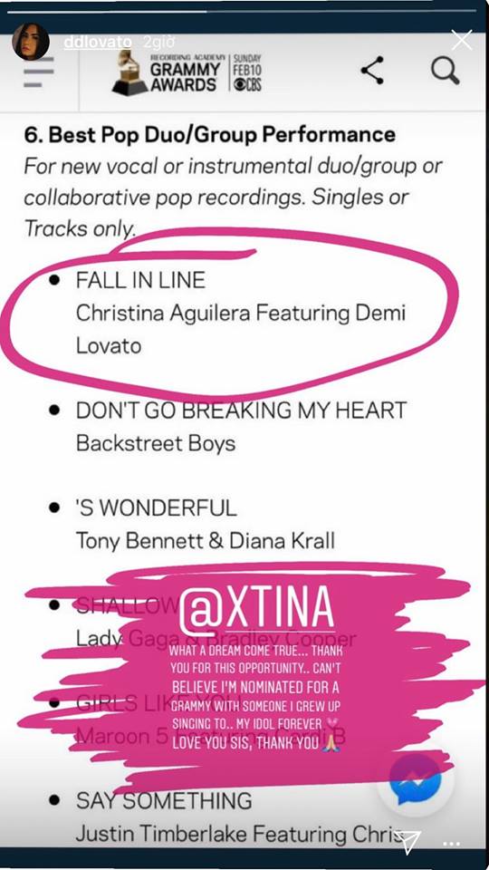 Giọng ca Heart Attack vừa thấy tên mình cùng cô bạn Christina Aguilera xuất hiện ở hạng mục hợp tác nhạc Pop xuất sắc nhất đã đăng ngay trên story Instagram của mình. Và cũng vì thế mà “gạch đá” ập tới! Cô nàng đã gạch tên đồng nghiệp đứng cùng hạng mục đề cử của mình là Lady Gaga, Bradley Cooper với Shallow và Maroon 5 cùng Cardi B với ca khúc Girls Like You để làm nền trống cho cô nàng điền tên cùng lời chia sẻ vui mừng đến Xtina!