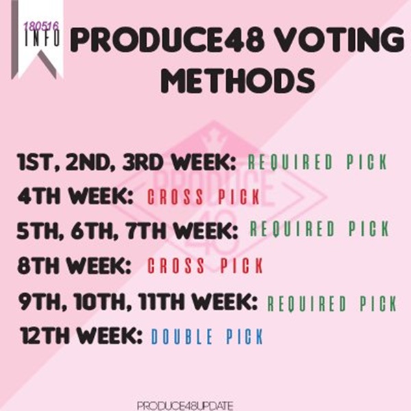 - Required Pick: Nếu bạn muốn vote cho 1 thí sinh Hàn Quốc nào đó thì phải dùng chính tài khoản đó để vote cho 1 thí sinh Nhật Bản và ngược lại. Tối đa được vote cho 6 Hàn - 6 Nhật. Cách này được áp dụng ở tuần thứ 1, 2, 3, 5, 6, 7, 9, 10 và 11.