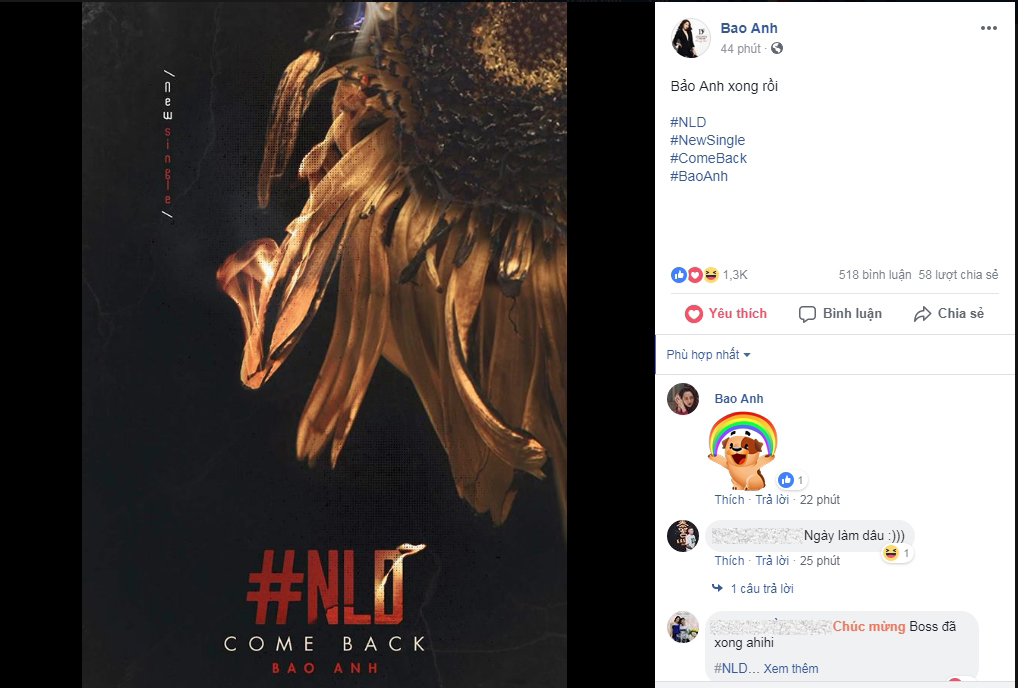 Mặc dù ngoài thông tin về tên viết tắt ca khúc thì Bảo Anh vẫn chưa tiết lộ ngày ra mắt, thế nhưng tin chắc rằng sẽ rất sớm thôi, bản tình ca của cô nàng này sẽ nhanh chóng trình làng và chạm đến trái tim người yêu nhạc. Cùng chờ đón #NLD của Bảo Anh nhé!