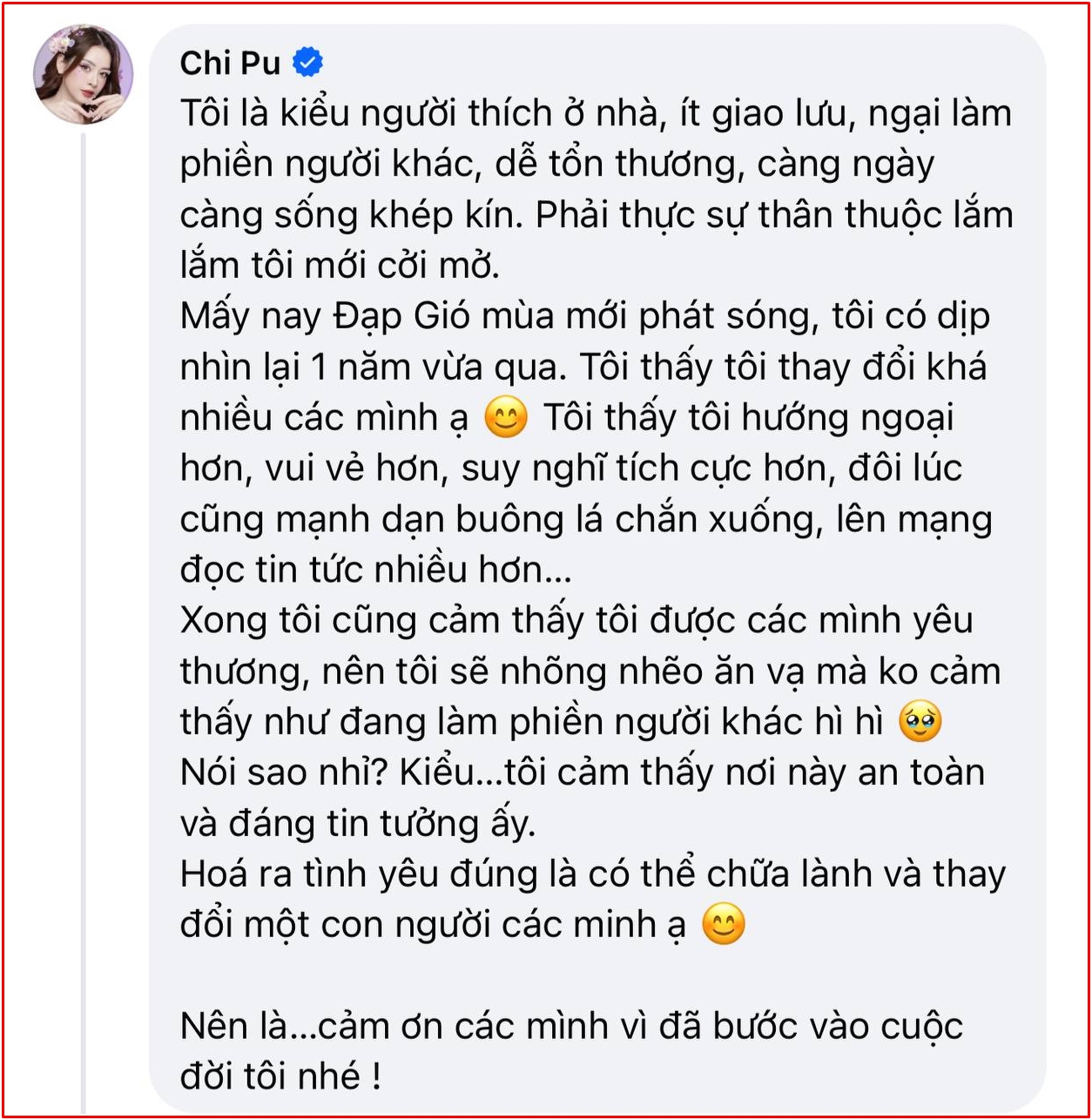 Hành trình Đạp gió 2023 đã thay đổi Chi Pu khá nhiều, từ một cô gái hướng nội trong tính cách, Chi Pu của hiện tại đã cởi mở và hướng ngoại hơn, suy nghĩ cũng theo chiều hướng tích cực hơn. Đồng thời, giọng ca sinh năm 1993 cũng dành lời cảm ơn đến cộng đồng fan vì "đã bước vào cuộc đời", giúp Chi Pu như có thêm một ngôi nhà thứ hai, sẵn sàng chia sẻ những tâm tư, buồn vui trong cuộc sống lẫn sự nghiệp.