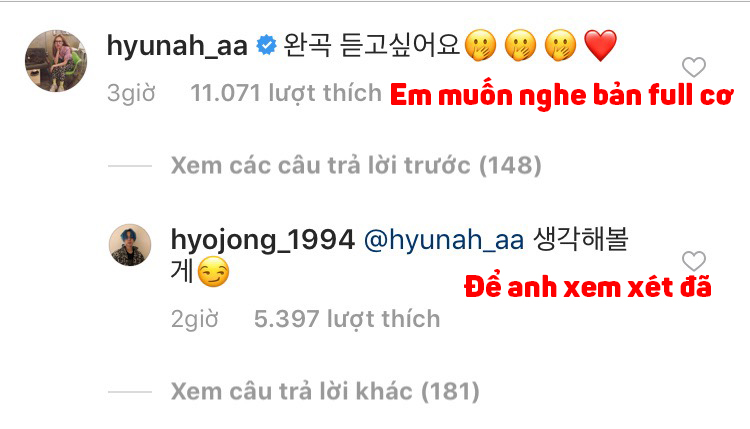 Trong khi khán giả vẫn còn đang “lụi tim” với màn nhõng nhẽo của HyunA khi đòi E'Dawn ra mắt ca khúc mới thì mới đây, cặp đôi lại khiến người hâm mộ vô cùng phấn khích khi đăng clip cùng nhau luyện tập vũ đạo. Cứ mỗi lần cô nàng HyunA đăng clip luyện tập lên Instagram là ít lâu sau đó đều cho ra mắt sản phẩm âm nhạc, vậy nên với clip luyện tập vô cùng chăm chỉ cùng E'Dawn này, khán giả đang rất mong chờ cặp đôi sẽ kết hợp và cùng nhau làm náo lọan ngành công nghiệp âm nhạc K-Pop.