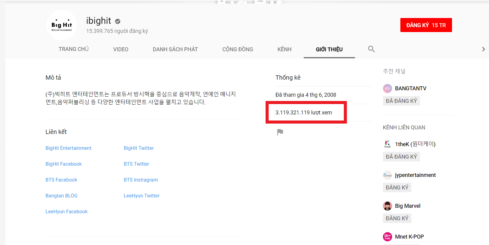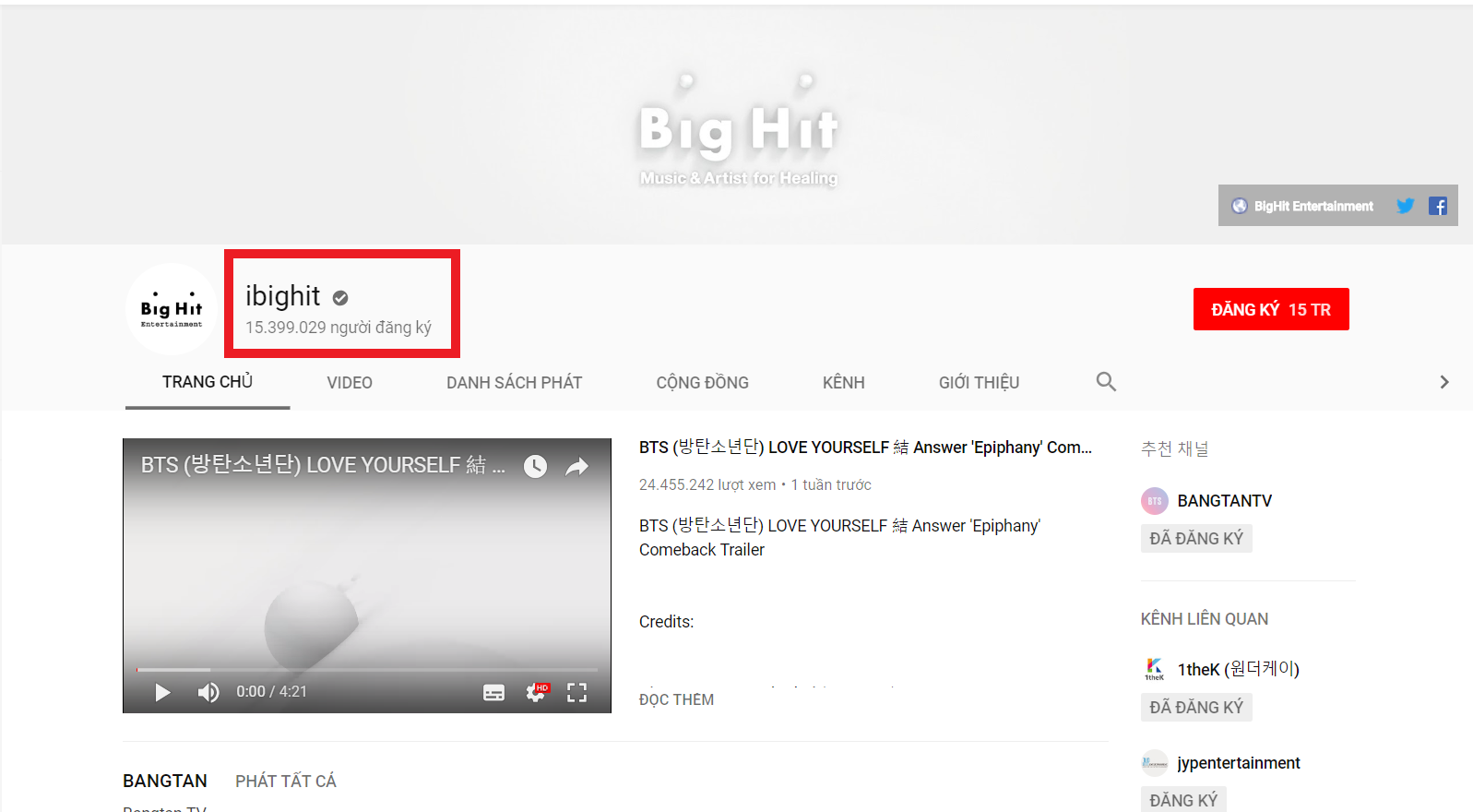 Vừa qua, kênh Youtube của Big Hit Entertainment - công ty quản lí BTS đã chính thức cán mốc 15.399.029 lượt đăng kí. Con số này đã giúp Big Hit vượt SM Entertainment trở thành kênh Youtube Kpop có lượng theo dõi lớn nhất.