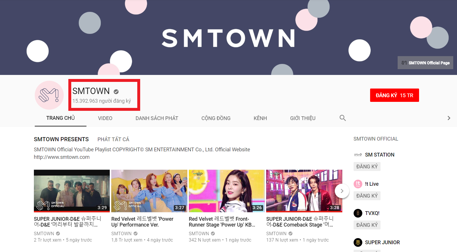Kênh Youtube của SM Entertainment thì sỡ hữu MV, màn trình diễn của TVXQ, SNSD, Super Junior, SHINee, Red Velvet, NCT…