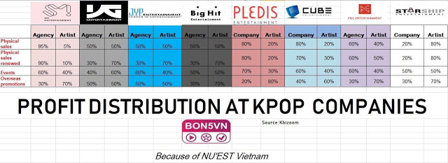 Theo đó, phần trăm lợi nhuận trung bình mà các nghệ sĩ nhận được theo thứ tự giảm giần là: Starship 70%, Bighit 60%, YG 57.5%, JYP 52.5%, FNC 50%, Pledis 37.5%, CUBE 37.5% và cuối cùng là SM chỉ với 31.2%.