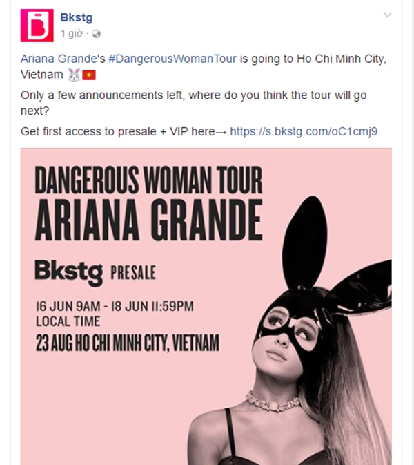 Mới đây, thông tin về việc Ariana Grande sẽ cùng Dangerous Woman Tour “đổ bộ” Việt Nam ngay trong tháng 8 đã thu hút sự quan tâm đặc biệt của người hâm mộ. Cụ thể, theo Bkstg thì TP HCM sẽ là điểm đáp của tour diễn này. Vé của chương trình cũng sẽ được bán rộng rãi từ ngày 16/6.