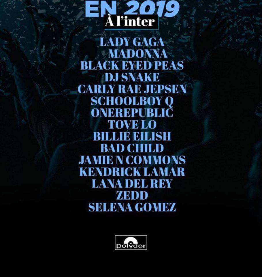 Theo danh sách từ hãng đĩa tung ra, năm 2019 tới đây ta sẽ được đón chào sự quay trở lại làng nhạc của hàng loạt những cái tên nóng đến bỏng tay như: Lady Gaga, Selena Gomez, Lana Del Rey, Carly Rae Jepsen, Kendrick Lamar, Zedd, Madonna, Billie Eilish, Tove Lo,…. Gần như toàn những gương mặt nóng hổi nhất của showbiz Mỹ đều sẽ rục rịch quay trở lại vào năm sau.
