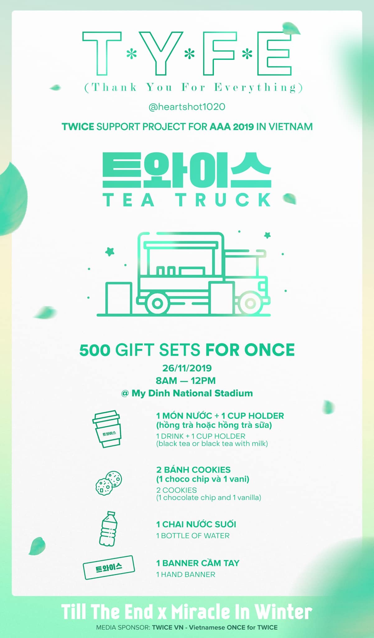 Ngoài ra, như đã nói ở trên, đây cũng là một trong hai dự án đi đầu trong việc đưa xe cà phê miễn phí tới Việt Nam. Cụ thể hơn, vào ngày 26/11, TYFE sẽ phát 500 set quà cho fan của Twice tham dự sự kiện. Trong đó bao gồm 1 món nước, 1 cup holder, 2 bánh cookies, 1 chai nước, 1 banner. Nếu bạn là fan của Twice và tham gia sự kiện, hãy tới ngay Tea Truck của TYFE để nhận món quà này từ 8h đến 12h nhé.