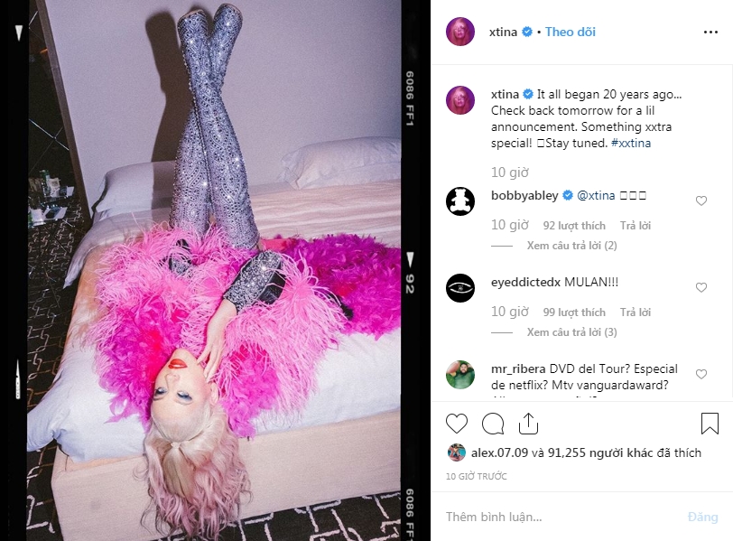 Cách đây vài giờ, Xtina đã đăng tải một bức hình với trang phục lộng lẫy kèm dòng cap “thả thính” người hâm mộ khiến ai nấy cũng tò mò: “Nó đã bắt đầu từ 20 năm về trước… Hãy chuẩn bị cho một thông báo mới vào ngày mai nhé. Một điều vô cùng đặc biệt. Theo dõi nhé.”