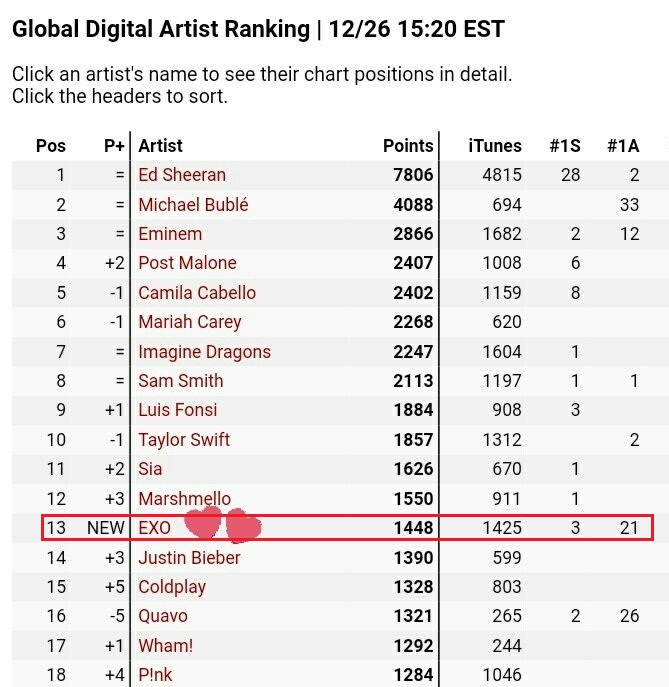 Album mới giúp EXO leo lên vị trí thứ 13 trên BXH Global Digital Artist Ranking.