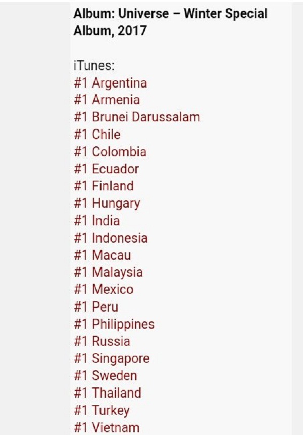 Không chỉ thành công tại các “đấu trường” âm nhạc trong nước, Universe cũng nắm giữ ngôi vị quán quân trên BXH iTunes Album Charts của 26 quốc gia trên toàn thế giới bao gồm Finland, Sweden, Turkey, Colombia, Hungary, Romania, Armenia, Ecuador, Peru, Nigeria, Guatemala, Brazil, Argentina, India, Russia, Mexico, Chile, Thailand, Singapore, Hong Kong, Vietnam, Philippines, Macau, Malaysia, Indonesia và Brunei. Tại Trung Quốc, Universe là ca khúc được nghe nhiều nhất theo thống kê của Xiami Music.