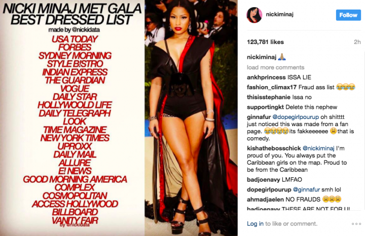 Buồn cười một chuyệ là đây không phải lần đầu tiên Nicki Minaj bị hớ vậy, cô đã từng 1 lần thay trắng đổi đen biến các thành tích của người khác thành của mình. Đó là ở sự kiện Met Gala 2017 - dạ tiệc thời trang lớn nhất thế giới, Nicki Minaj đã tưởng bở cô là nhân vật được báo chí phong tặng là ăn mặc đẹp nhất đêm . Cũng lần đó, cô cũng đem khoe đầy trên Instagram nhưng hóa ra…đó là hàng giả.