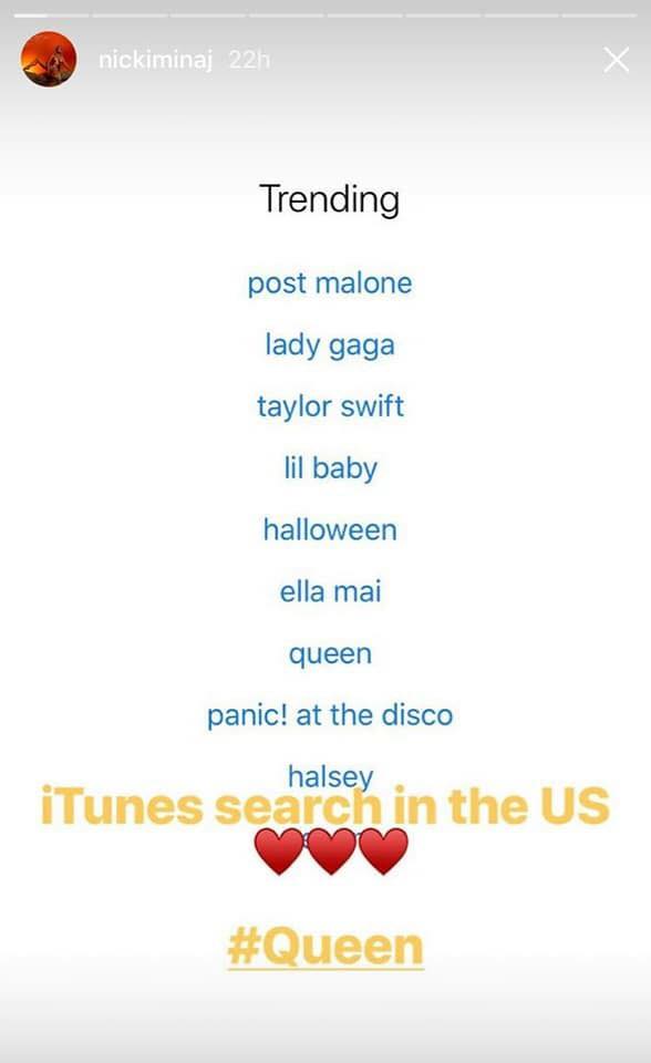 Nicki Minaj - nữ hoàng nhạc rap đã tưởng bở trending Queen trên Itunes là về album của mình, cô đã ngay lập tức đăng Instagram Story để khoe mẽ nhưng không ngờ mình đã bị hớ. Thực chất, trending này đang nói đến nhóm nhạc rock thập niên 70s tên Queen chứ không hề liên quan tí nào đến album mới ra mắt của Nicki Minaj gần đây cả. (lý do trending là nhóm nhạc Queen được đàn em biểu diễn tri ân tại giải thưởng âm nhạc Mỹ AMAs).
