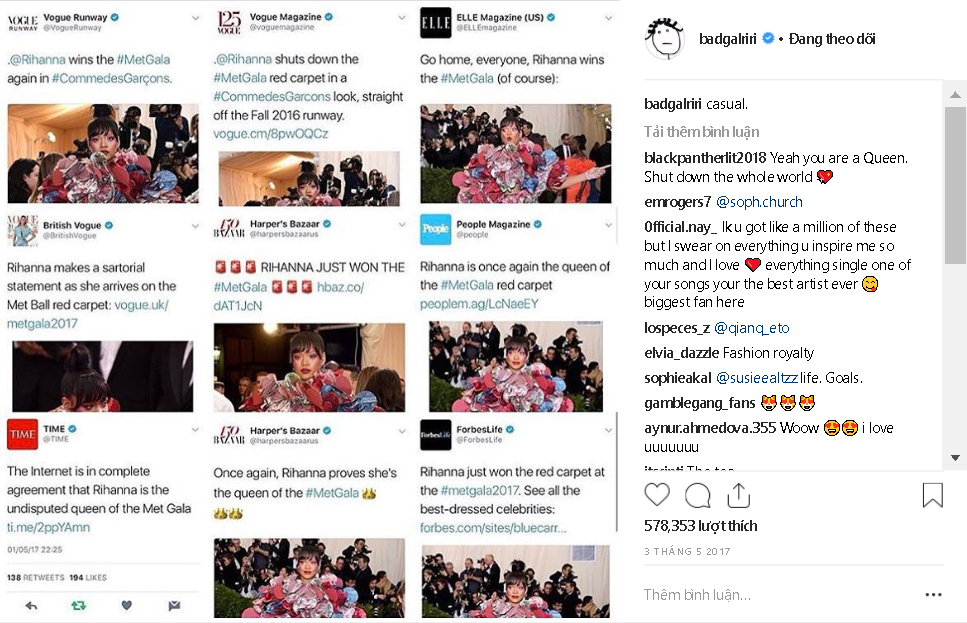 Nhưng ngay sau khi đăng tải bức hình đó, cô đã bị người bạn cũ Rihanna xối 1 gáo nước lạnh vào người vì Rihanna mới chính là người đạt lấy danh hiệu mặc đẹp nhất đêm hôm đấy. Nữ hoàng nhạc rap đã bị 1 phen muối mặt đến mức phải âm thầm xóa hình đi, thế mà nay vẫn chứng nào tật nấy đây.