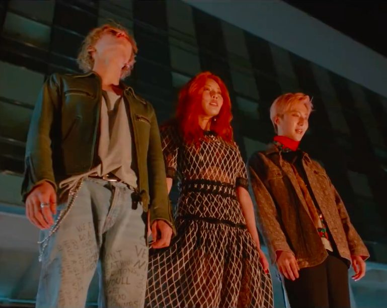 Lúc chuẩn bị nhảy, Hui đứng bên trái còn E'Dawn đứng bên phải HyunA.