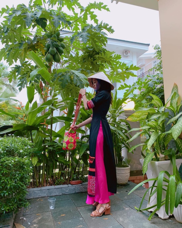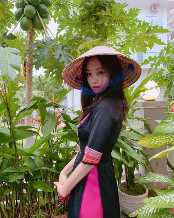 Hyomin diện áo dài thổ cẩm do fan tặng trong dịp tham quan Nha Trang.