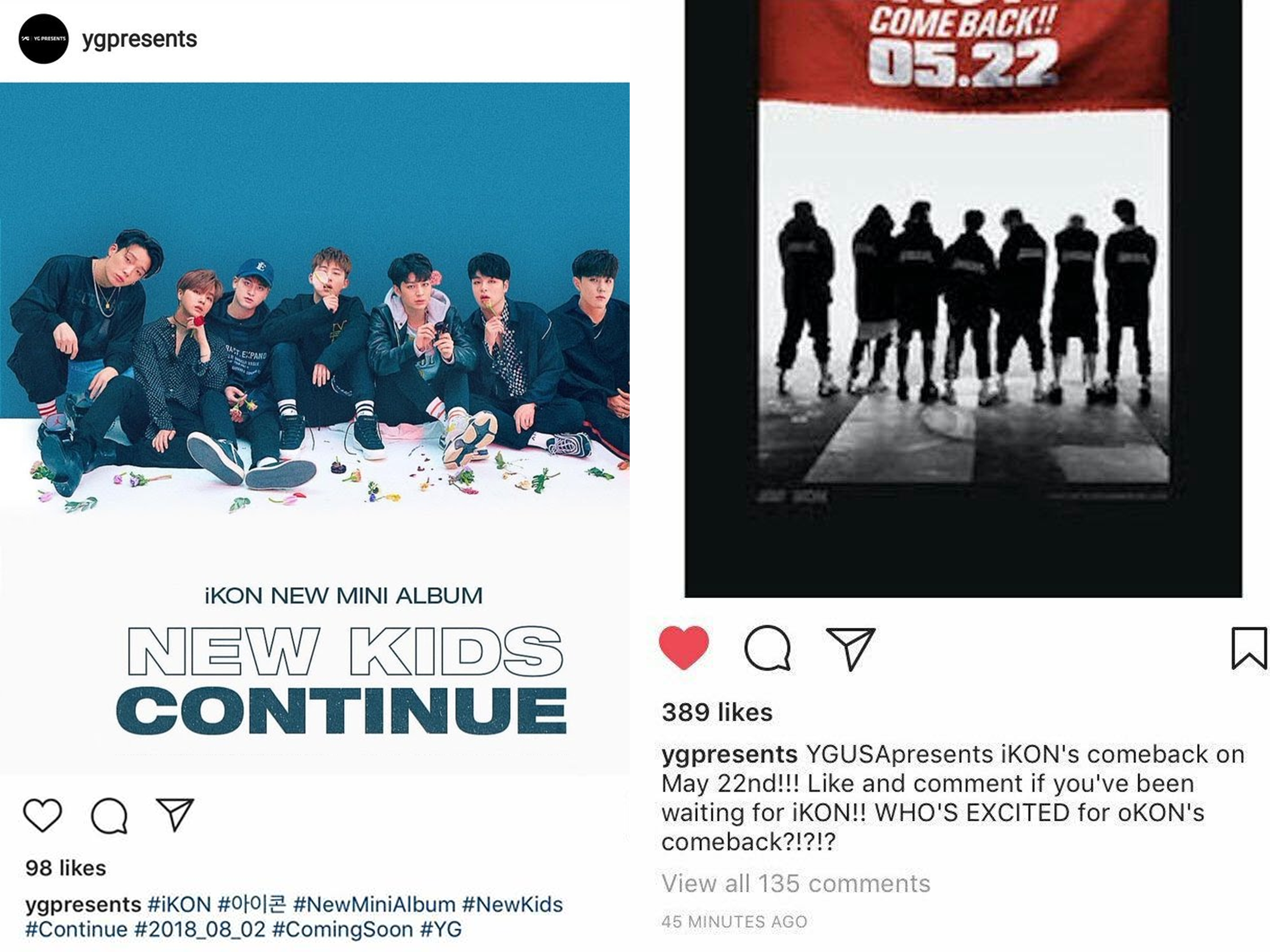 Vào ngày 16 tháng 7, tài khoản Instagram chính thức của YG Presents (tài khoản chính thức của YG Entertainment tại Mỹ ) đã làm lộ một bức ảnh của iKON cho đợt comeback sắp tới. Dựa theo bài đăng này, mini album tiếp theo của nhóm nhạc từng tạo ra bản hit “Love Scenario” sẽ mang tên là NEW KIDS: CONTINUE và được ra mắt vào ngày 2/8 năm nay. Được biết đây không phải là lần đầu YG Presents làm lộ ảnh của iKON, năm ngoái, đợt mini album NEW KIDS: BEGIN của nhóm cũng bị tài khoản này “lỡ tay” leak trước ảnh teaser.