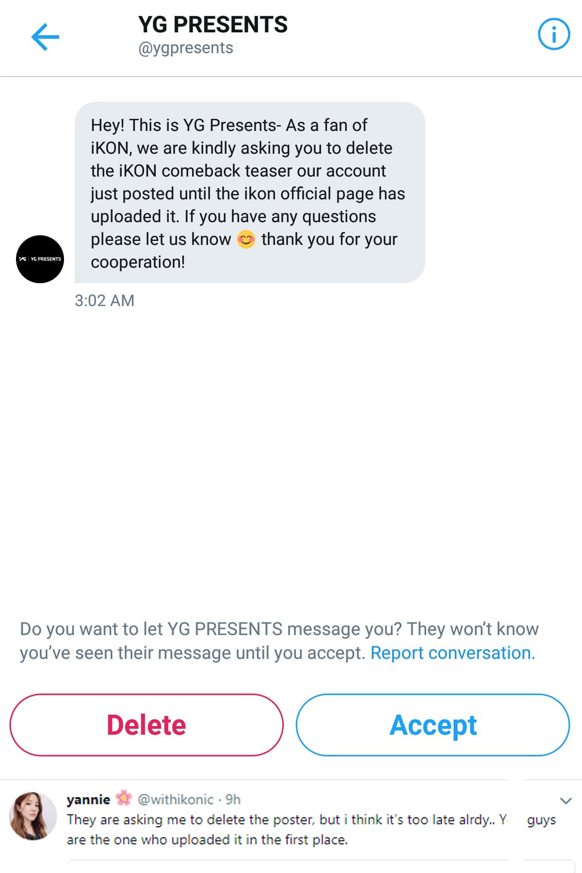 Dù sớm xóa đi bài đăng này nhưng người hâm mộ cũng đã nhanh chóng chụp được màn hình và chia sẻ bức ảnh này trên phương tiện truyền thông xã hội. Bất ngờ hơn, YG Presents đã nhắn tin cho một số fan yêu cầu hãy gỡ bức ảnh này xuống với nội dung: “Đây là YG Presents. Là fan của iKON, chúng tôi rất vui lòng yêu cầu bạn xóa đoạn teaser trả lại iKON mà tài khoản của chúng tôi vừa đăng cho đến khi trang chính thức của iKON tải lên. Câu hỏi xin vui lòng cho chúng tôi biết. Cảm ơn sự hợp tác của bạn! ” Tuy nhiên, điều này đã quá muộn màng và nhiều fan hâm mộ còn tweet lại như sau: “Họ đang yêu cầu tôi xóa áp phích, nhưng tôi nghĩ đã quá muộn rồi .. Chính bạn là người đã tải nó lên ngay từ đầu mà.”