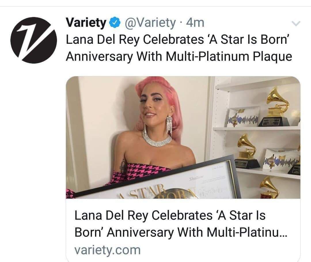 Mới đây, cộng đồng fan US-UK đang truyền tay nhau bức ảnh vô cùng thú vị về sự cố oái oăm liên quan đến Lady Gaga và Lana Del Rey. Cụ thể, chuyên trang giải trí Variety đã có một sự nhầm lẫn khá “tai hại” về 2 nữ ca sĩ này. Variety đã chia sẻ bức ảnh của Lady Gaga với dòng caption vô cùng hài hước: “Nữ ngôi sao phim A Star Is Born - Lana Del Rey ăn mừng kỷ niệm với chứng nhận bạch kim”, trong khi ai cũng biết người thủ vai nữ chính trong bộ phim đó là giọng ca Bad Romance.