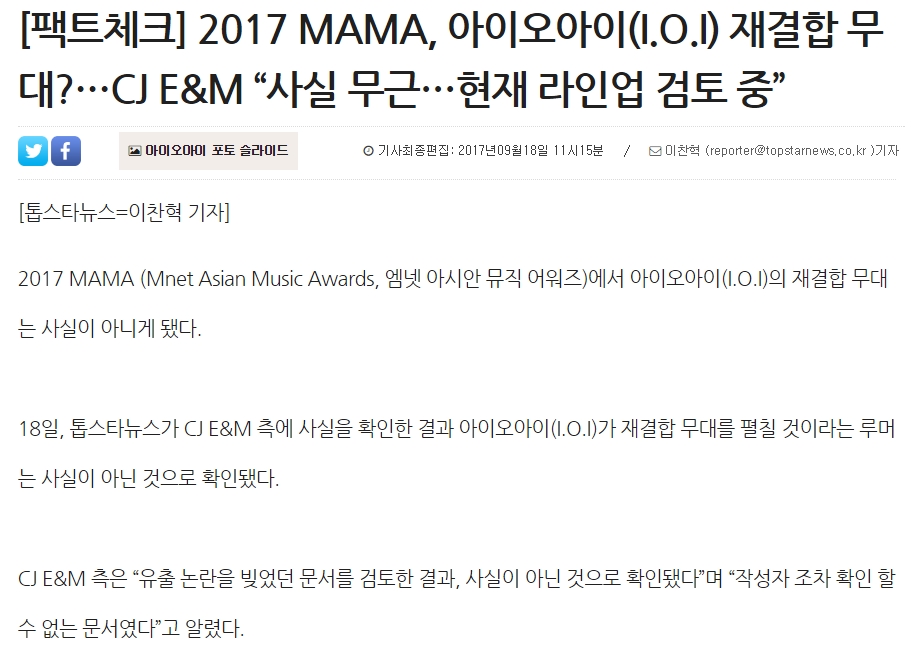 Tuy nhiên mới đây, CJ E&M, đơn vị tổ chức MAMA 2017 đã chính thức lên tiếng về tin đồn này. Theo đó, tập đoàn giải trí lớn của Hàn Quốc cho biết danh sách biểu diễn bị rò rỉ trên là giả và chuyện I.O.I tái hợp cũng là điều không đúng. “Có vẻ như các fan đã tự tạo ra danh sách này. Chúng tôi vẫn còn đang xem xét về dàn nghệ sĩ tham dự và sẽ sớm có thông báo chính thức trong thời gian tới” - Đại diện CJ chia sẻ.