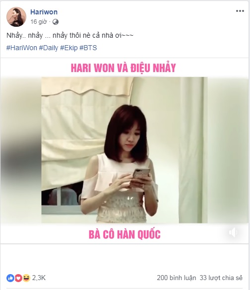 Đáng chú ý, nếu như trong MV Hari Won có những vũ đạo thuần thục và chuyên nghiệp thì với đoạn clip được đăng tải, cô nàng lại thể hiện điệu nhảy được ví như… các bà cô Hàn Quốc. Đoạn clip ngay khi lên sóng đã nhận được rất nhiều lượt xem cũng như chia sẻ từ người hâm mộ nữ ca sĩ.