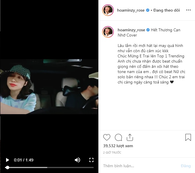 Đoạn clip và dòng trạng thái của Hòa Minzy trên Instagram.