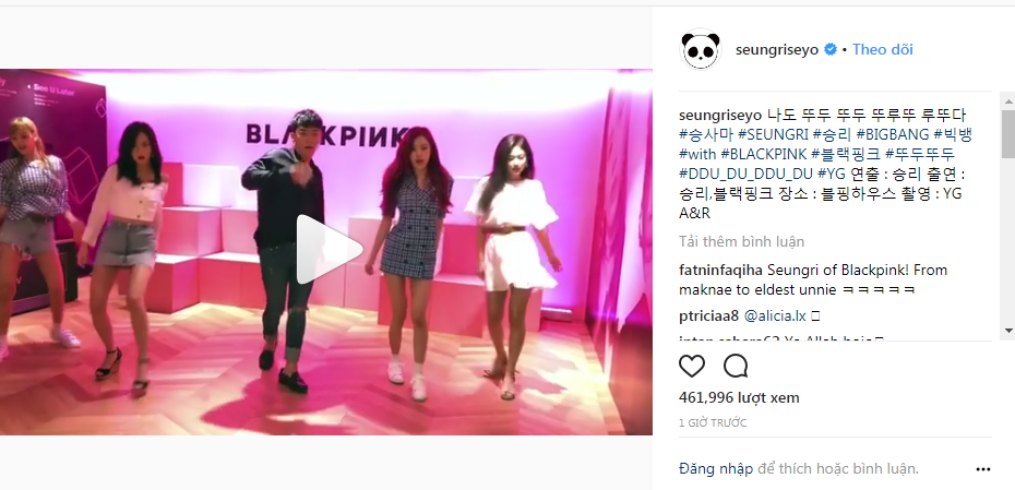 Mới đây, Seungri (BigBang) vừa đăng tải một clip thú vị trên trang instagram cá nhân của mình. Trong đó, “em út” BigBang chia sẻ hình ảnh cùng nhảy theo vũ đạo hit mới Ddu-Du Ddu-Du với 4 thành viên BlackPink.